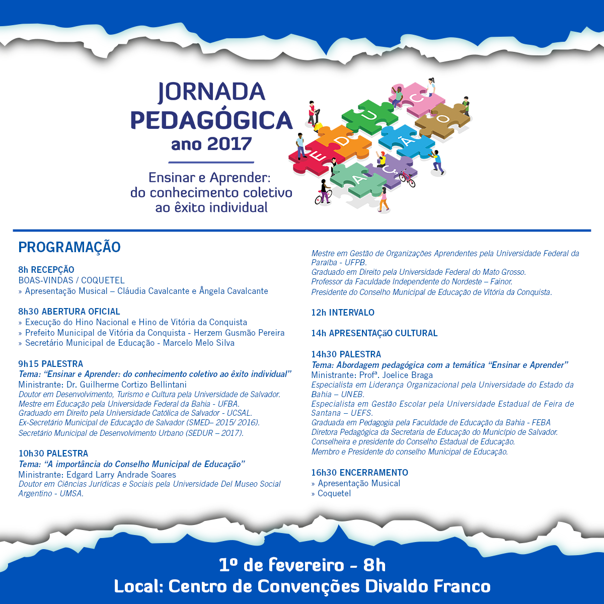 Realizada pela Secretaria Municipal de Educação, por meio da coordenação pedagógica, a Jornada Pedagógica é um encontro no qual relevantes temas serão debatidos por profissionais reconhecidos nacionalmente que, atentos às novas demandas, farão reflexões importantes voltadas para a melhoria do processo de ensino-aprendizagem. Este ano, a Jornada terá como tema “Ensinar e Aprender: do conhecimento coletivo ao êxito individual” e contará com a palestra do ex-secretário de educação de Salvador, Guilherme Bellintani.