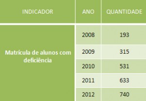 A Política Nacional de Educação Especial, na perspectiva da Educação Inclusiva, assegura acesso ao ensino regular a alunos com deficiência física, mental, intelectual ou sensorial, transtornos globais de desenvolvimento e com altas habilidades/superdotação. Na tabela abaixo é possível observar a evolução da matrícula das crianças com deficiência na rede municipal de ensino de Vitória da Conquista.