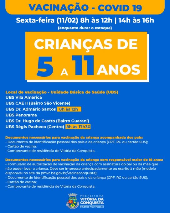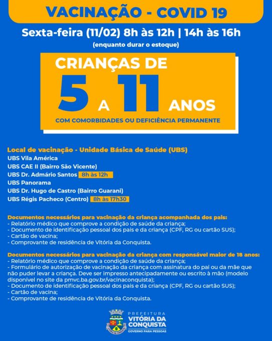 Para vacinação da criança, é preciso apresentar o documento de identificação com CPF pais ou responsáveis e também da criança (CPF, RG ou cartão SUS), cartão de vacina e comprovante de residência de Vitória da Conquista. As crianças com comorbidades ou deficiência permanente, serão vacinadas mediante a apresentação do relatório médico que comprove a condição de saúde.