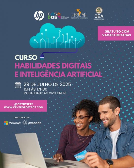 Estão abertas até esta segunda-feira (28), as inscrições, por meio do link, para o curso gratuito de Habilidades Digitais e Inteligência Artificial, que será realizado nesta terça-feira (29), das 15h às 17h30. O curso é uma parceria da Prefeitura de Vitória da Conquista, por meio da Secretaria de Desenvolvimento Econômico, com o Centro de Tecnologia e Inovação Casa dos Sete, que integra o Projeto potencIA, em parceria com The Trust for the Americas e HP Foundation, e tem o apoio da Microsoft e Avanade.