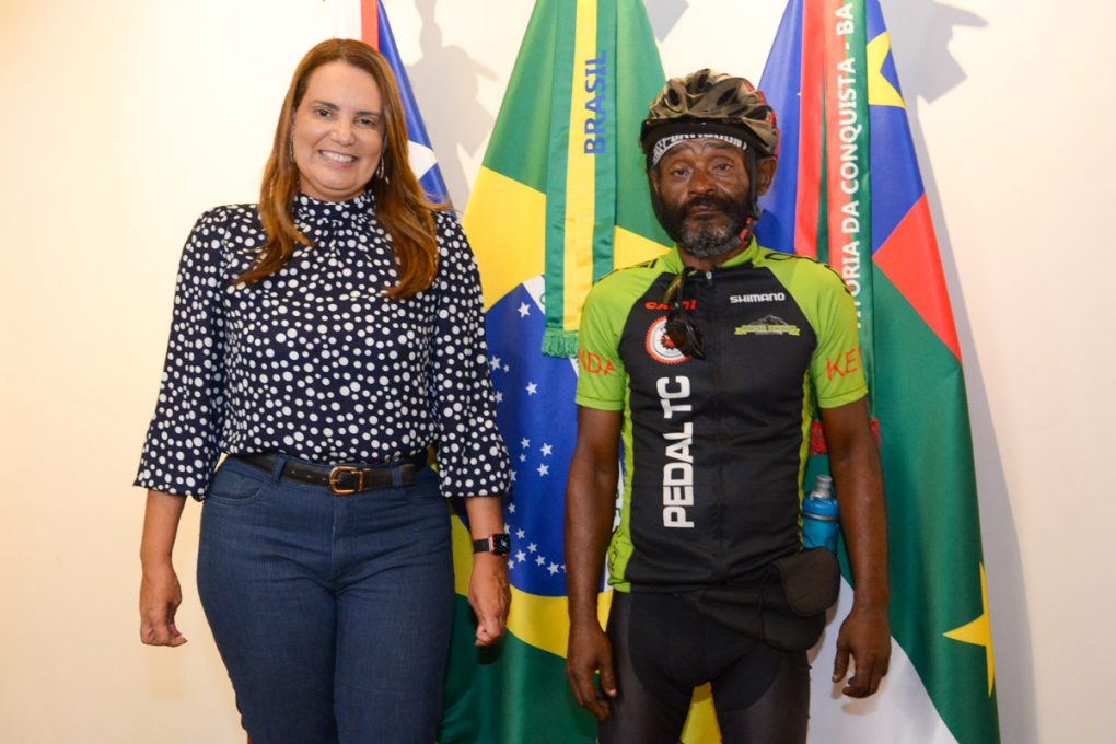 Em meio às reuniões da agenda oficial desta segunda-feira (27), a prefeita Sheila Lemos reservou um tempo para receber o ciclista Antônio Rogério do Nascimento, de 48 anos. Conhecido como Neguinho do Asfalto, ele queria apenas uma fotografia ao lado da prefeita, assim como costuma fazer em todas as cidades por onde passa
