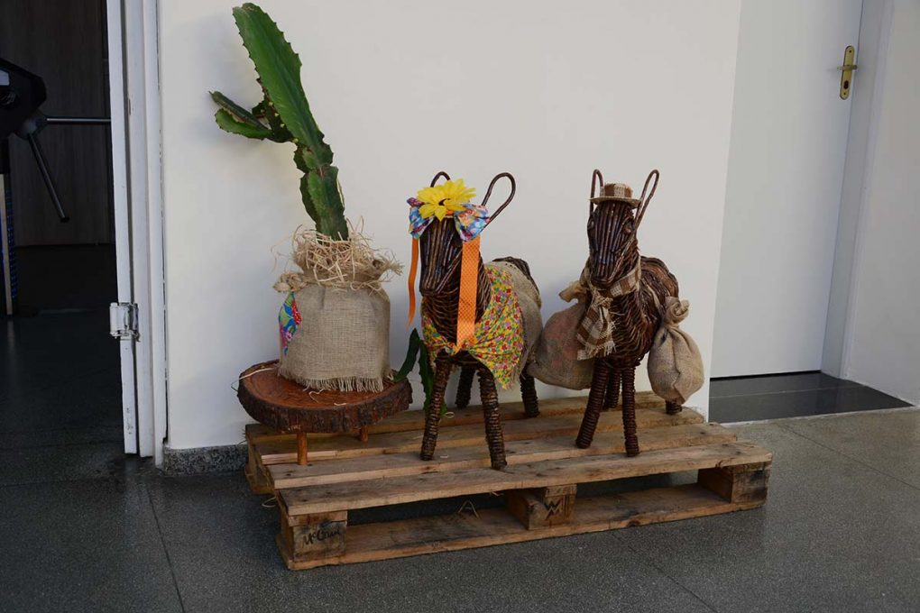 Os artigos foram confeccionados pelos próprios servidores do setor, cinco no total, que utilizaram material do almoxarifado da Prefeitura para compor as peças. Boa parte delas feitas com madeiras e sucata reaproveitada e também algumas peças do acervo pessoal de alguns colaboradores. “A intenção é dar certa familiaridade ao ambiente de trabalho, com o espírito das festas juninas e um ambiente nostálgico”, informou o gerente de Comunicação e Zeladoria, Reinaldo Macedo.