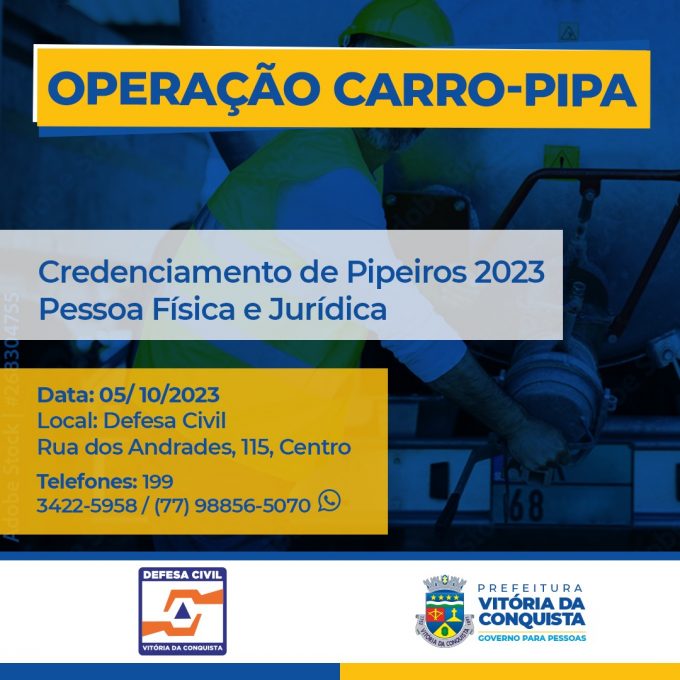 Já os pipeiros interessados em atuar na distribuição de água na zona rural do município, por meio da Operação Carro-Pipa, desenvolvida pelo Ministério da Integração Nacional e pelo Exército Brasileiro, o cadastramento acontecerá entre os dias 23 e 27 de outubro, no mesmo endereço.