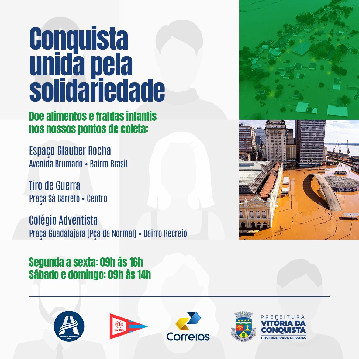 A Prefeitura de Vitória da Conquista, por meio da Defesa Civil, repassou aos Correios, nessa sexta-feira (17), a primeira parte das doações arrecadadas através da campanha “Conquista unida pela solidariedade”, que visa amparar os moradores do Rio Grande do Sul afetados pelas enchentes.