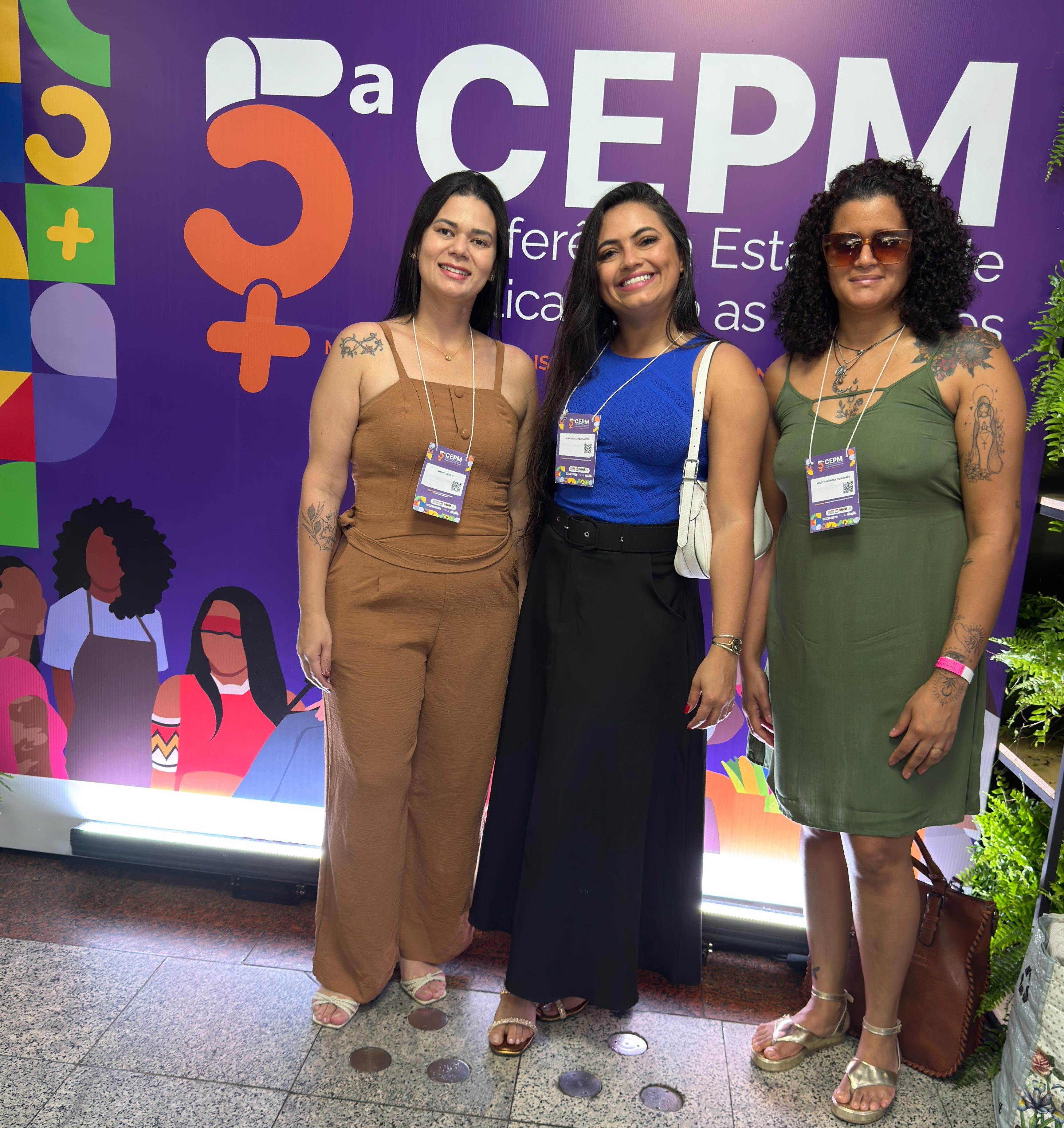 Representando o Município de Vitória da Conquista, participam do evento a coordenadora de Enfrentamento à Violência, Monique Cajaíba; a coordenadora de Autonomia e Políticas Transversais, Melry Amaral, e a servidora do Centro de Referência Albertina Vasconcelos (Crav), Kelly Fagundes. As participantes são as três delegadas eleitas na Conferência Municipal de Políticas para Mulheres e Conferência Territorial do Sudoeste da Bahia.