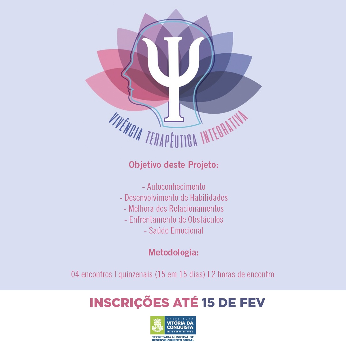 O Projeto Vivência Terapêutica Integrativa vai ser desenvolvido em quatro encontros coletivos, com duração de duas horas, abordando o autoconhecimento, desenvolvimento de habilidades, melhora nos relacionamentos, enfrentamento de obstáculos e saúde emocional.