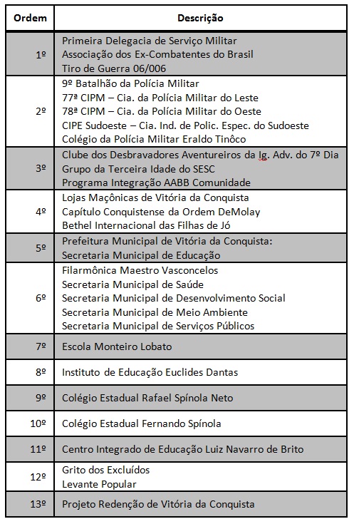 Confira a ordem da atividade cívica: