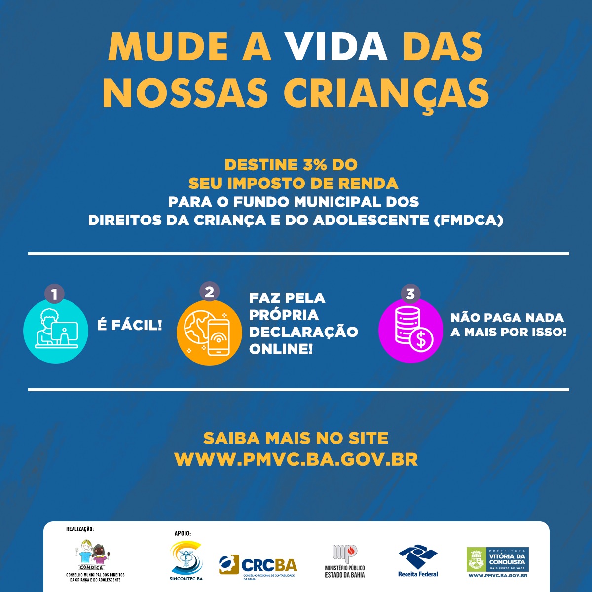 A partir do dia 02 de março de 2020, o Governo Federal começa a receber a Declaração do Imposto de Renda (IR) de todos os contribuintes. Aproveitando este momento, você pode contribuir para a melhoria nas condições de vida de crianças e adolescentes de Vitória da Conquista, destinando a um fundo municipal, no ato da declaração online, 3% do seu imposto de renda. A pessoa jurídica também poderá deduzir até 1% do Imposto.