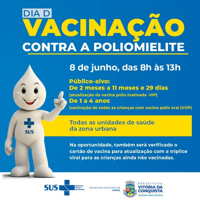 Para a vacinação, serão utilizadas as vacinas oral poliomielite (VOP), conhecida como gotinha, e a inativada poliomielite (VIP), injetável. A meta é alcançar a cobertura de, no mínimo, 95% das crianças dessa faixa etária, estimada em 24.328 em Vitória da Conquista.