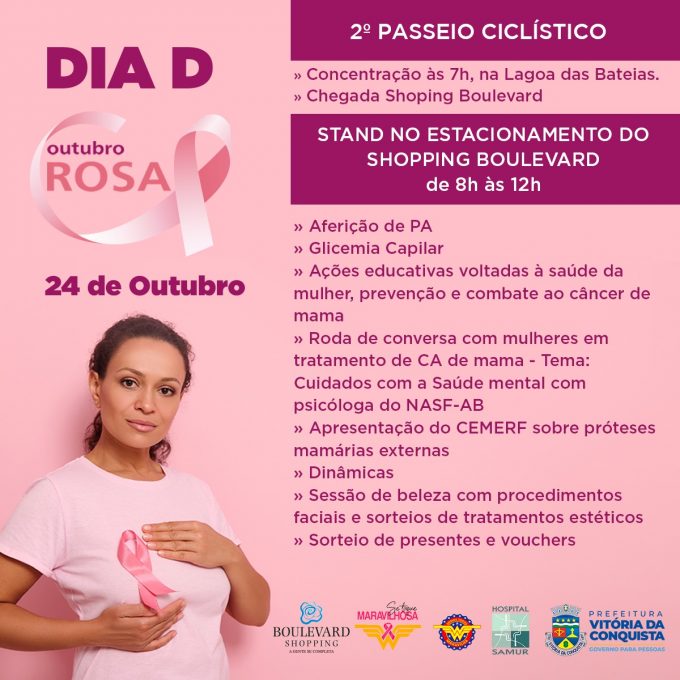 No domingo (24), a Secretaria Municipal de Saúde (SMS) vai realizar um dia D da Campanha do Outubro Rosa, intensificando as ações de prevenção contra o câncer de mama. A atividade começará com um passeio ciclístico, organizado pelo Grupo Somos Todas Maravilhas, que partirá da Lagoa das Bateias em direção ao Boulevard Shopping, onde vários serviços de saúde serão prestados às mulheres participantes.