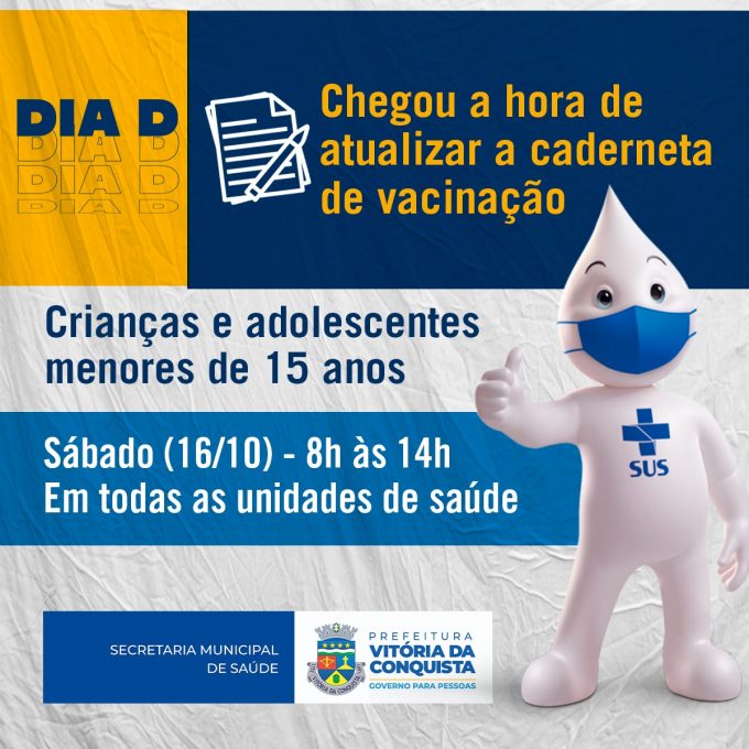 Neste sábado (16), acontece o dia D da campanha de atualização da caderneta de vacinação das crianças e adolescentes menores de 15 anos em todas as unidades de saúde da área urbana.