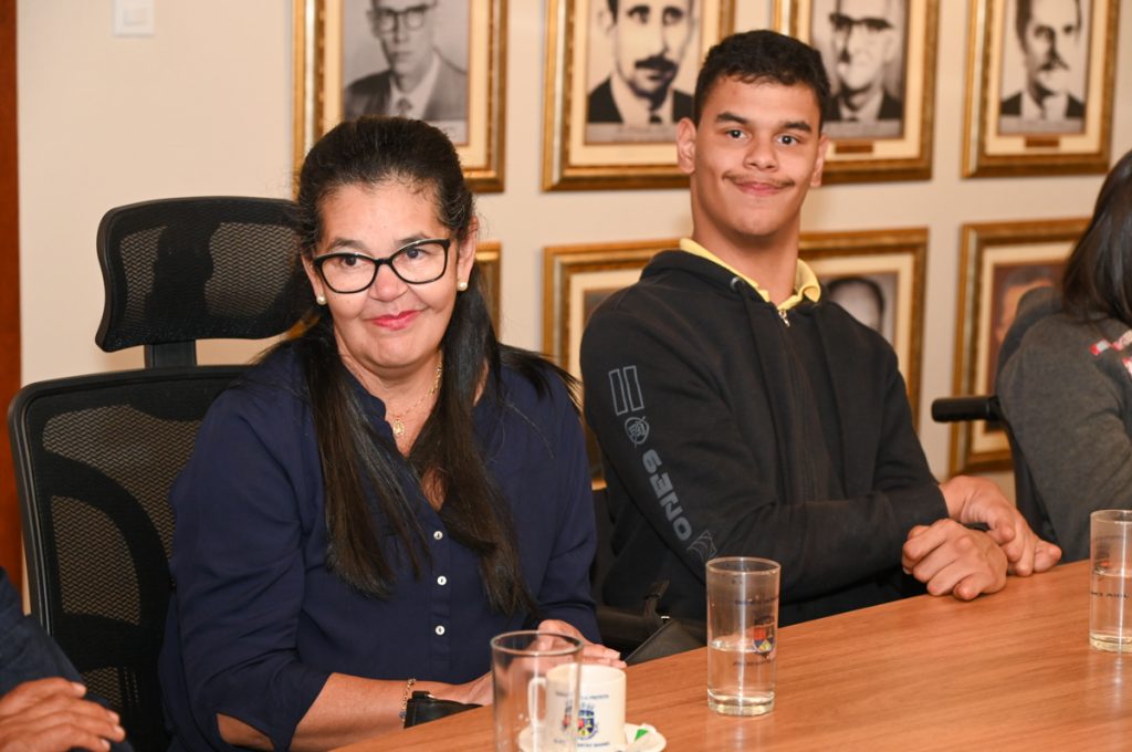 Para tratar de possíveis iniciativas públicas que proporcionem atividades aos jovens com necessidades especiais, após finalizarem a formação escolar, o Governo Municipal realizou, nesta segunda-feira (5), uma audiência com João Vitor, de 22 anos, e Mariana Portela, de 25 anos, pessoas com deficiência, e suas respectivas mães, Maria Soares de Oliveira e Nailza Teixeira Portela. O encontro contou com a presença do coordenador pedagógico da Rede Municipal, Ronilson Ferreira, e do presidente da Câmara de Vereadores, Hermínio Oliveira.