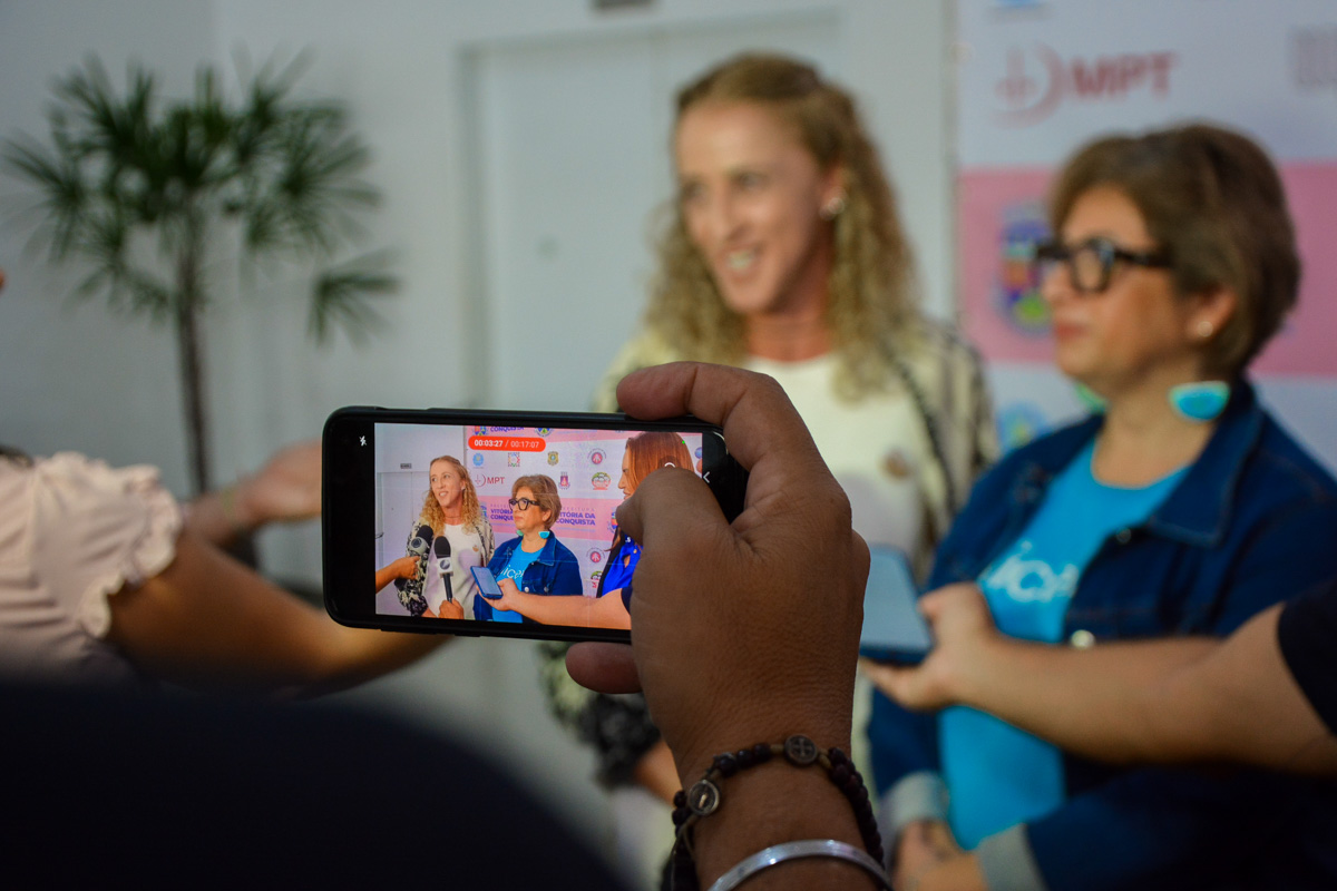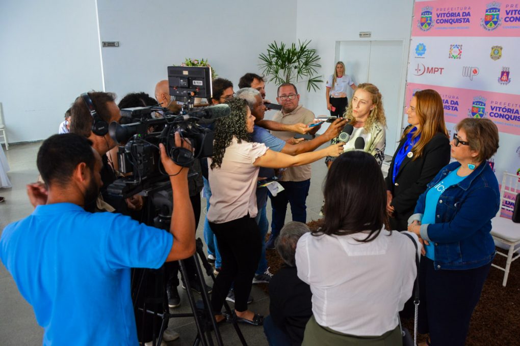 Durante a cerimônia realizada nesta terça-feira (12), no auditório do Cemae, que oficializou o lançamento da série de vídeos e dos volumes impressos que sistematizam a experiência da implementação da Lei 13.431/2017 em Vitória da Conquista, a prefeita Sheila Lemos concedeu entrevista coletiva à imprensa local. Enquanto conversou com os jornalistas, Sheila esteve acompanhada por Laís Pereto, diretora-executiva da Childhood Brasil, e por Rosana Vega, chefe de Área de Proteção de Crianças e Adolescentes Contra as Violências do Unicef.