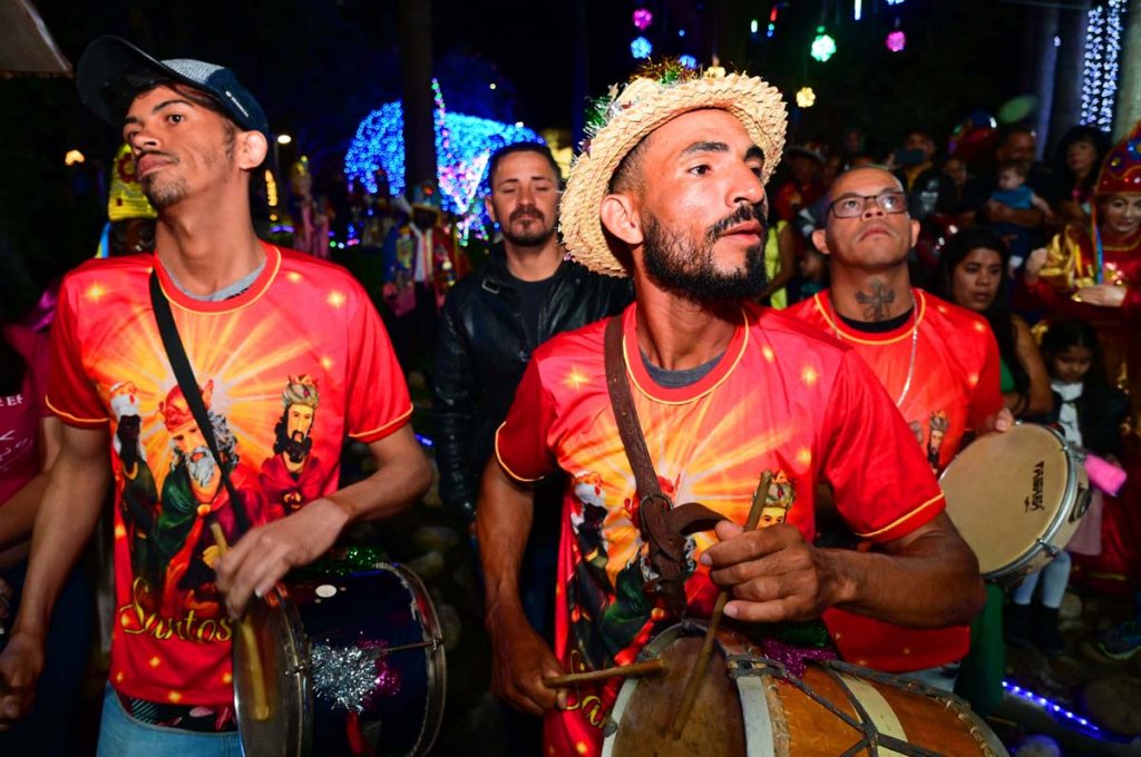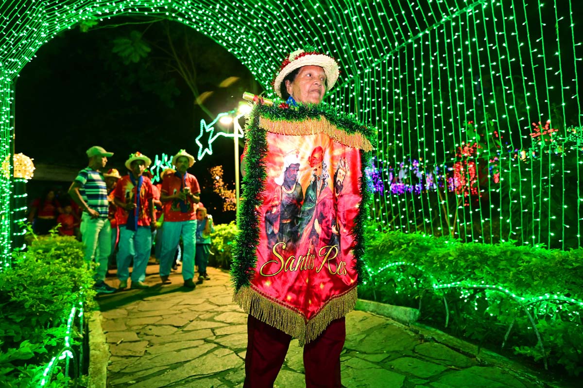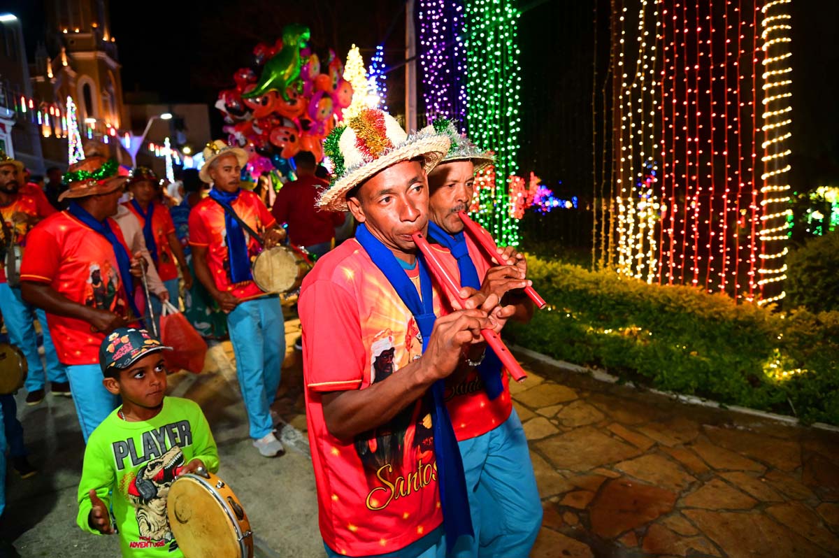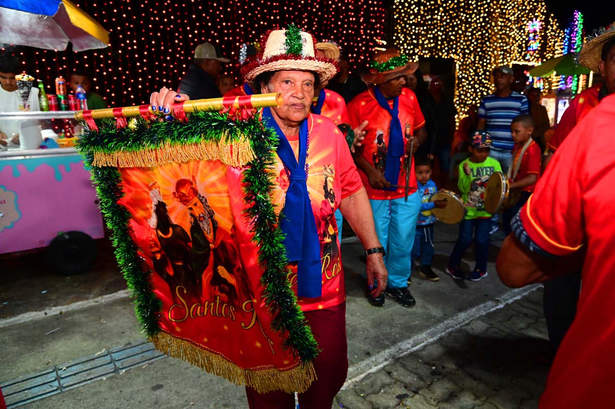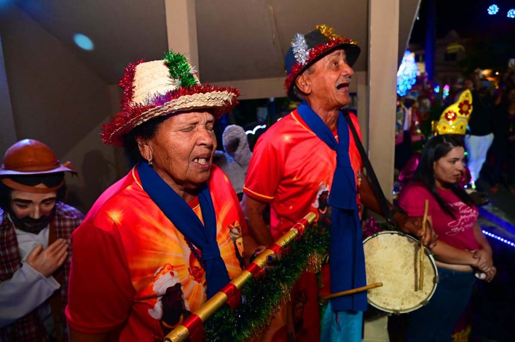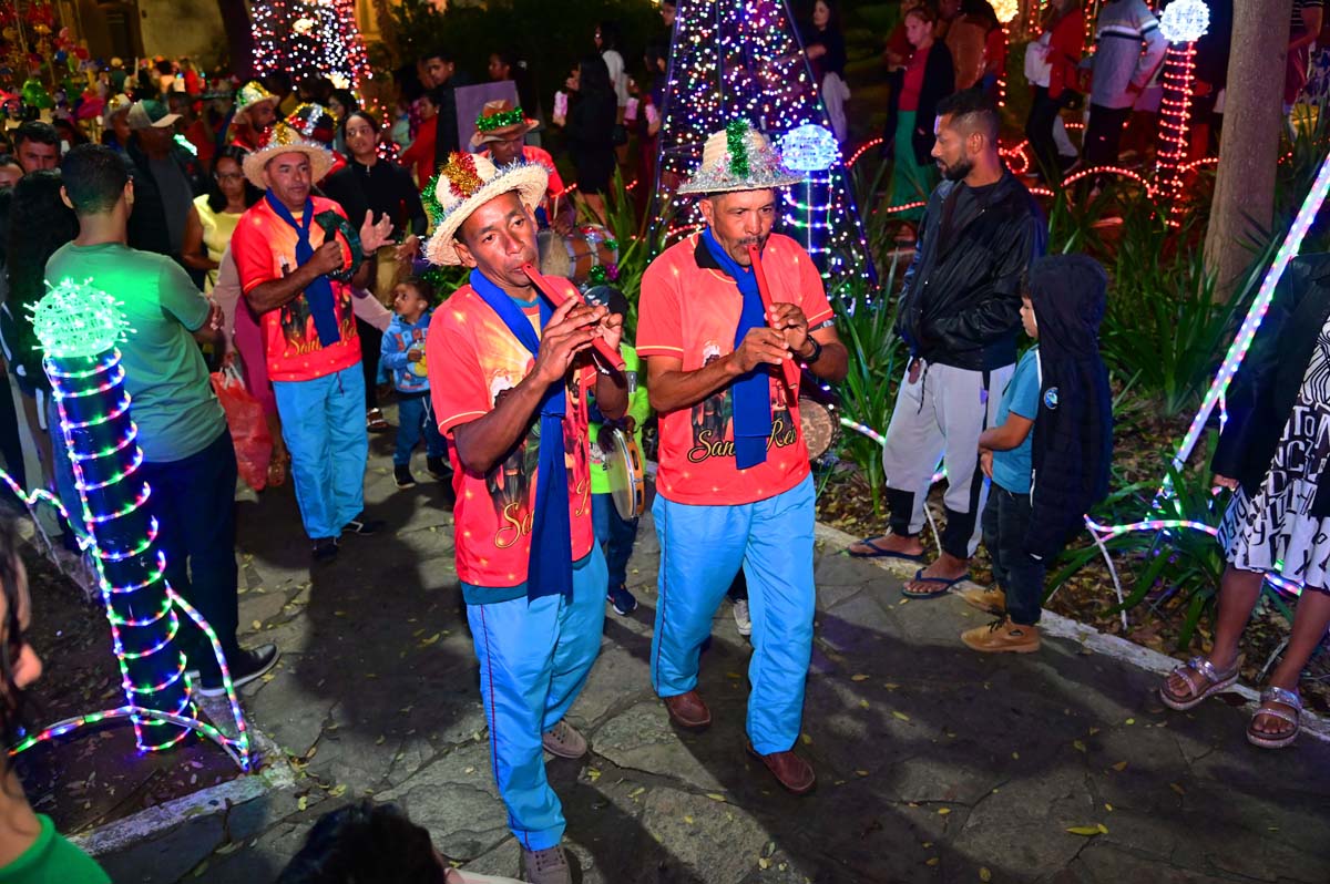 Logo no início da noite, o brilho e a fé do Terno de Reis Sagrado Coração de Jesus, do bairro Cidade Molelo, animou a praça. Com 29 anos de história, o grupo mantém viva a tradição, que é passada de geração para geração, como explicou Ana Elita Matos, de 80 anos, e que desde os 10 participa da folia de reis. “A gente tem que passar, porque se os novos não seguirem com essa fé, que é tão linda, vai acabar e a gente não quer isso, pois é muito lindo”, disse.