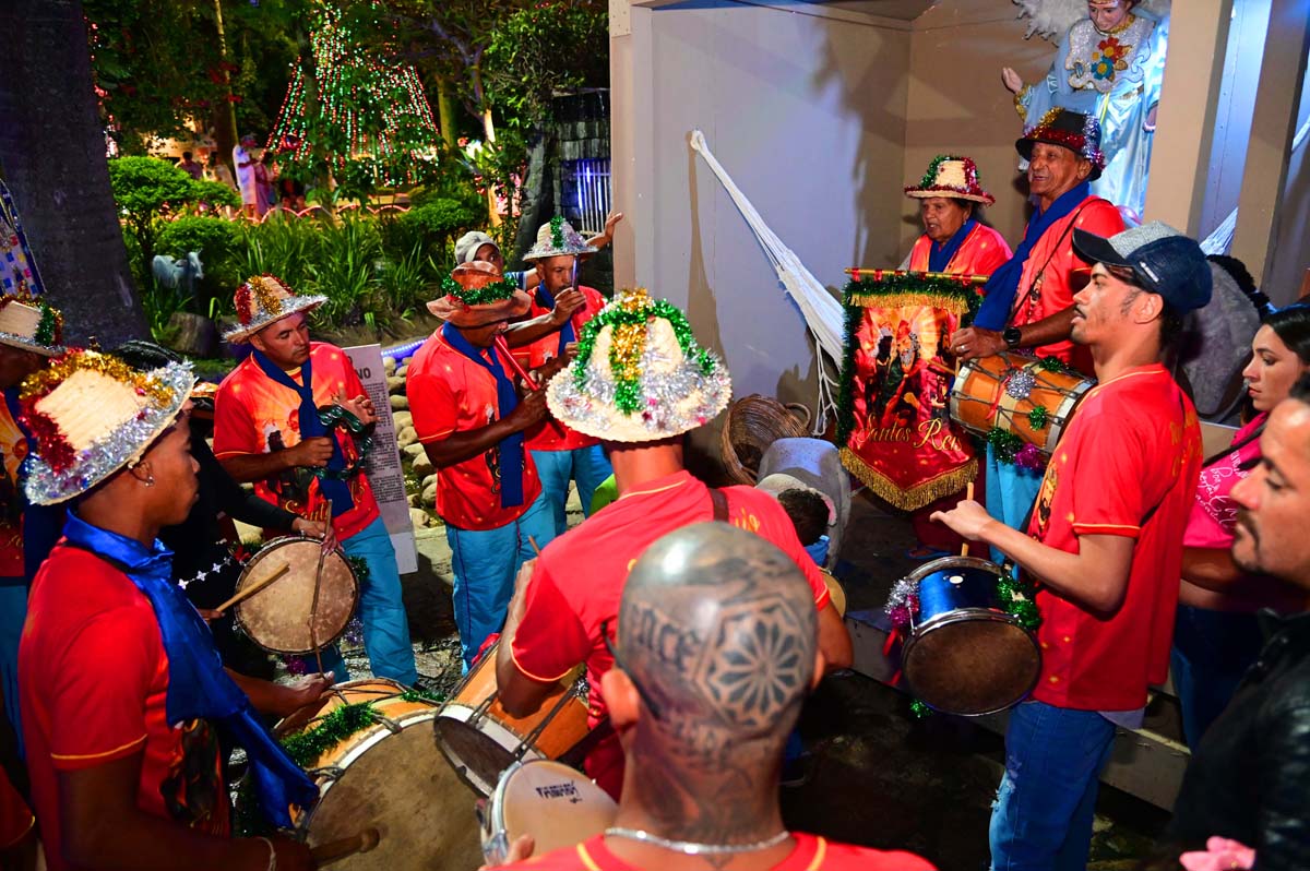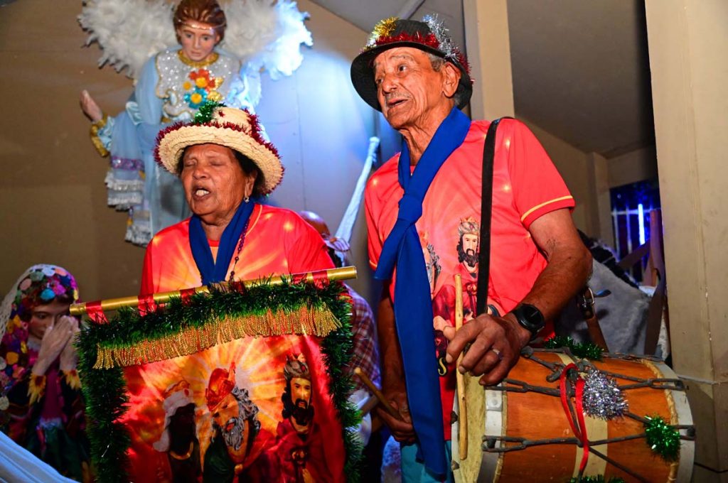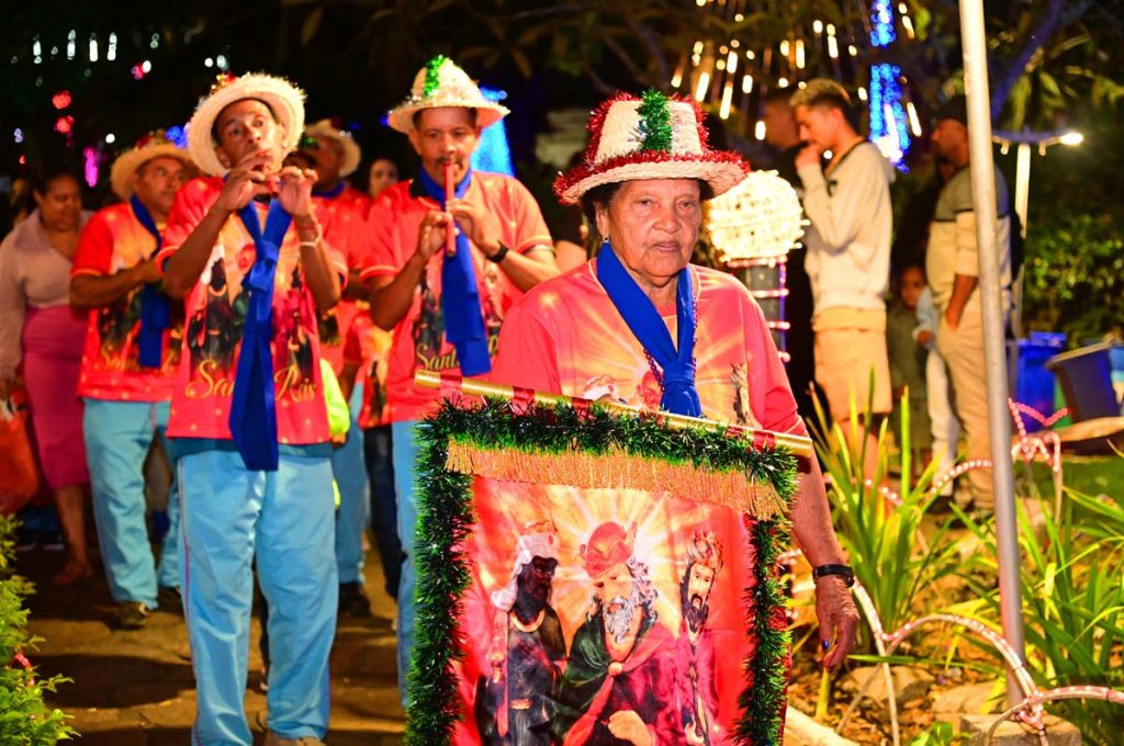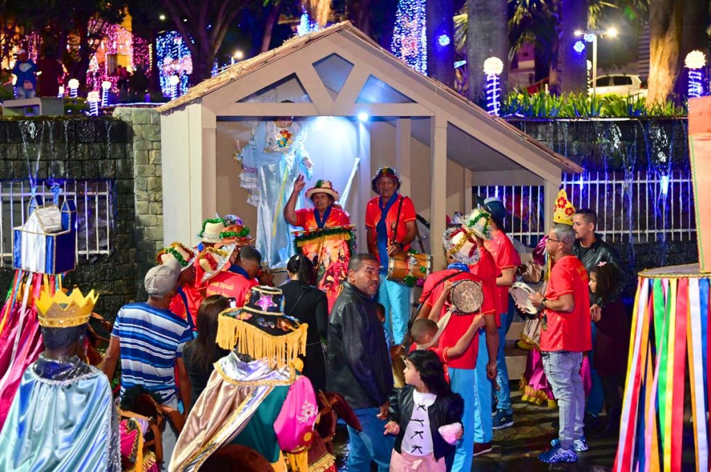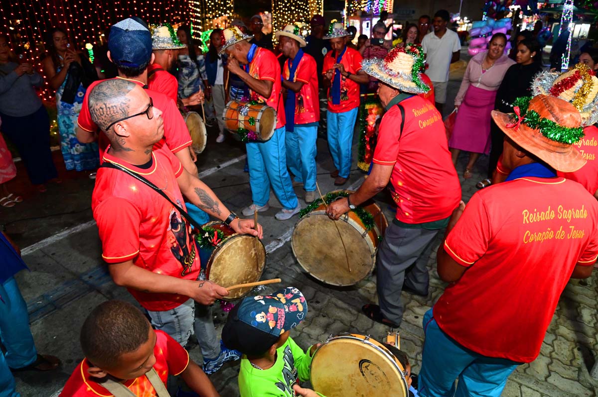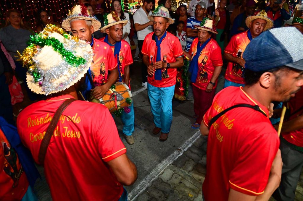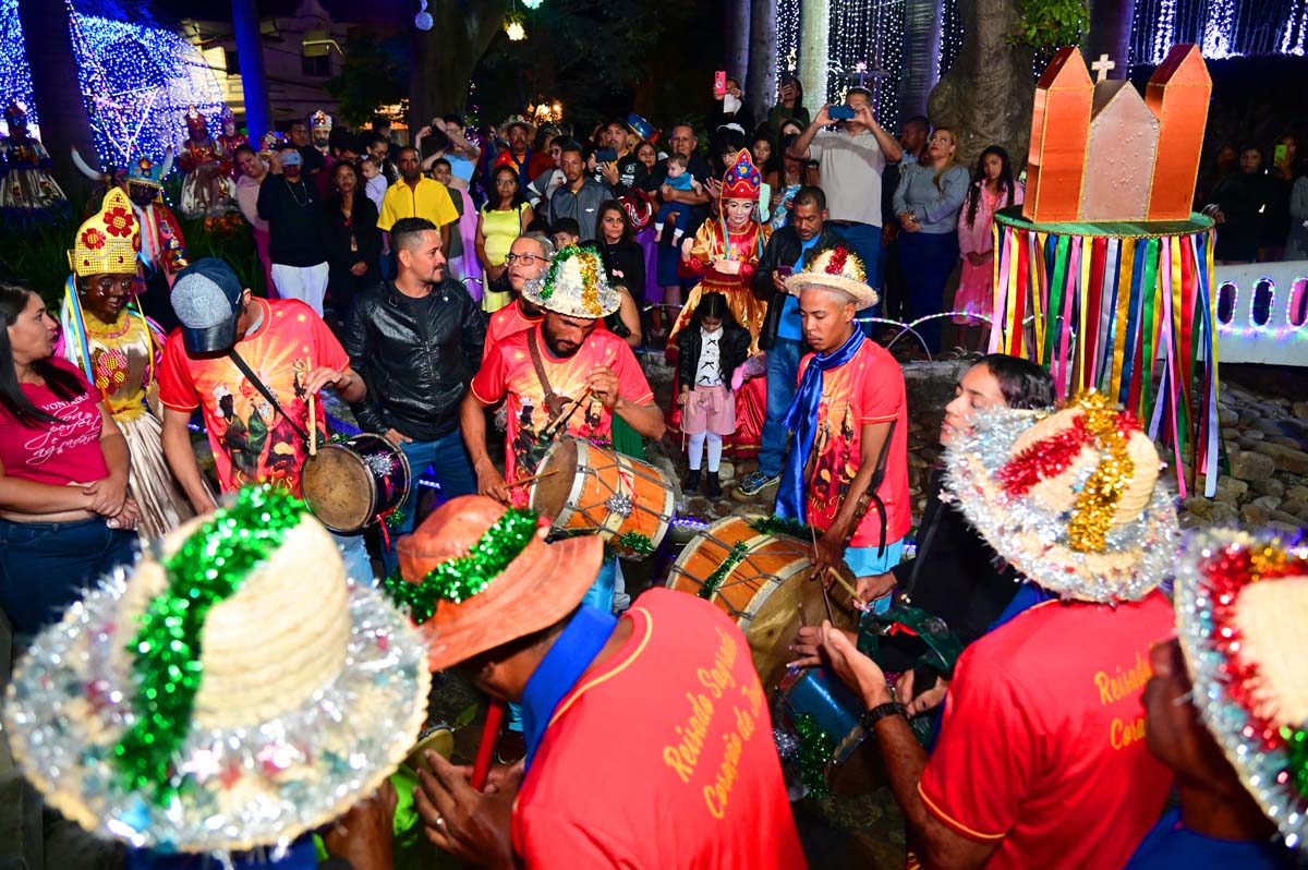 Logo no início da noite, o brilho e a fé do Terno de Reis Sagrado Coração de Jesus, do bairro Cidade Molelo, animou a praça. Com 29 anos de história, o grupo mantém viva a tradição, que é passada de geração para geração, como explicou Ana Elita Matos, de 80 anos, e que desde os 10 participa da folia de reis. “A gente tem que passar, porque se os novos não seguirem com essa fé, que é tão linda, vai acabar e a gente não quer isso, pois é muito lindo”, disse.