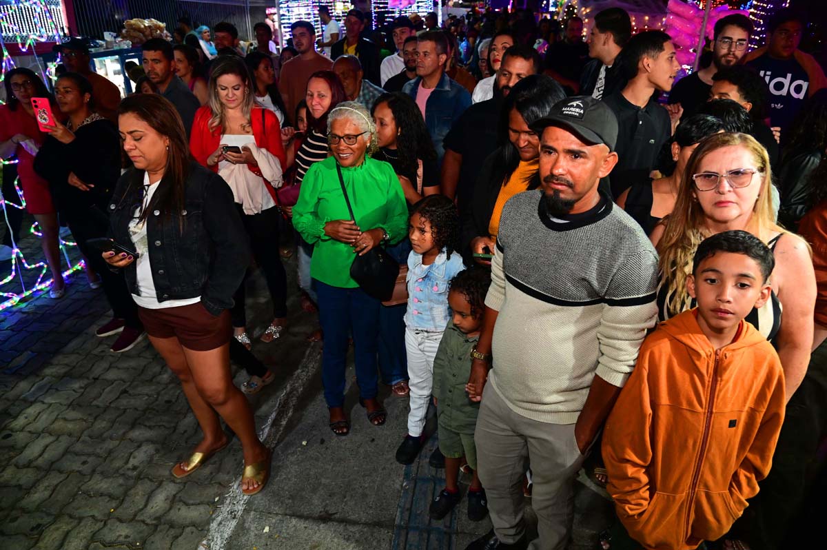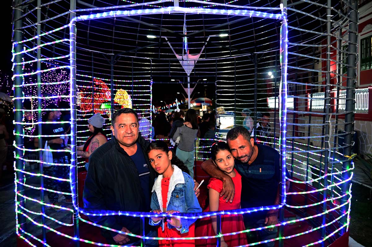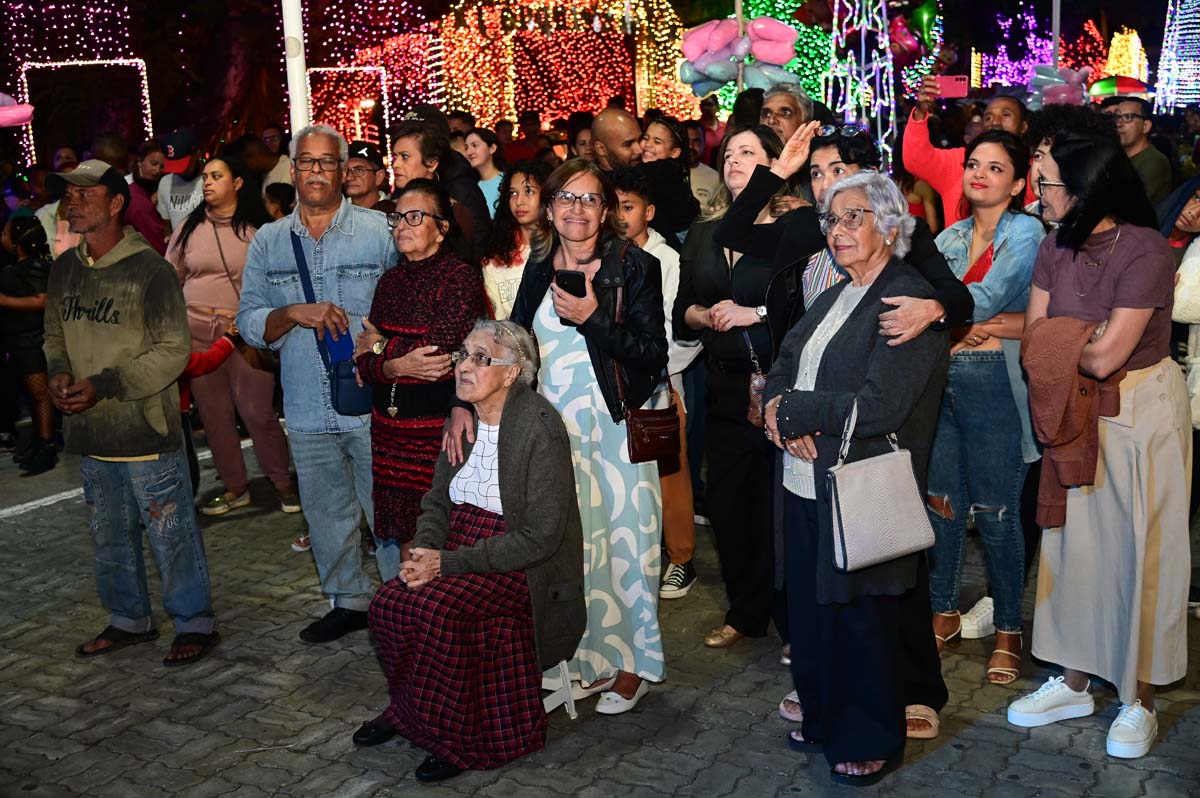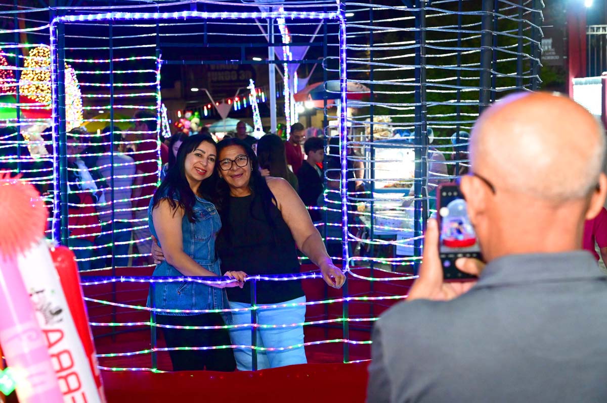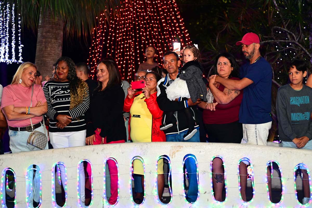 A noite deste domingo (21), na praça Tancredo Neves, foi de muita movimentação, com famílias e grupos de amigos que apreciaram a decoração e se encantaram com a programação do Natal Conquista de Luz 2025.