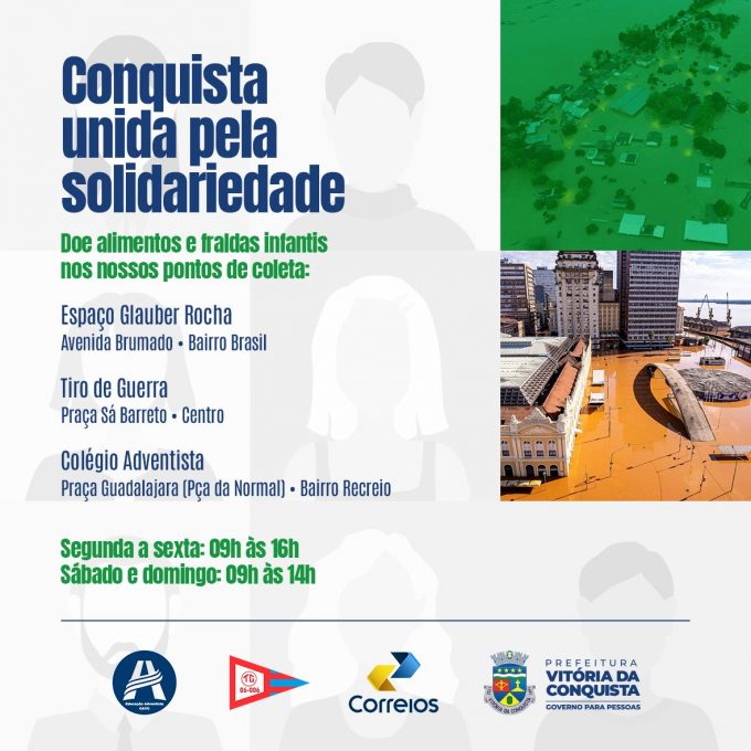Com o tema “Conquista unida pela solidariedade”, a Prefeitura de Vitória da Conquista, em parceria com os Correios, iniciou nesta segunda-feira (13), uma campanha de arrecadação de fraldas descartáveis infantis e alimentos não perecíveis que serão destinados às vítimas das enchentes do Rio Grande do Sul.