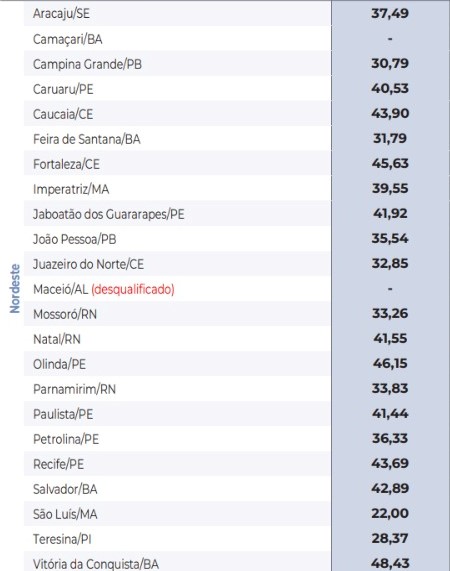 Visualização da parte da tabela com os índices de Liberdade Econômica no Nordeste