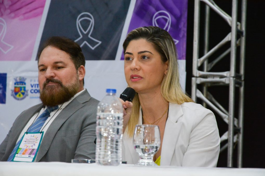 Em participação na abertura do primeiro Simpósio da Rede de Atenção ao Câncer da Região Sudoeste, promovido nesta terça-feira (9), pela Secretaria Municipal de Saúde (SMS), em parceria com o Unacon Samur e do Unacon do Hospital Geral de Vitória da Conquista (HGVC), a prefeita Sheila Lemos enfatizou a importância da promoção à saúde pelos profissionais, como forma de orientar as pessoas em relação ao cuidado preventivo.