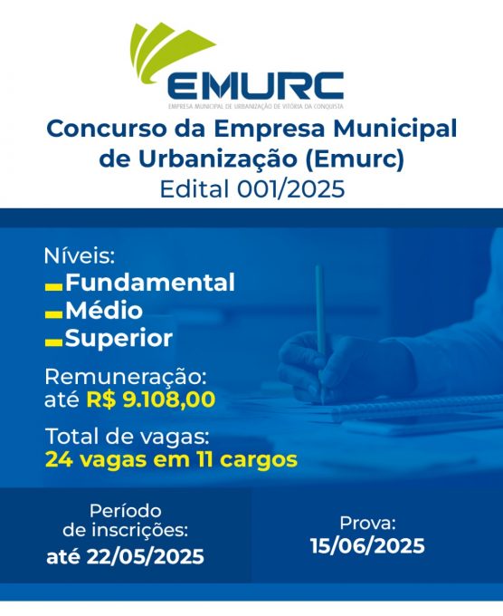 A Empresa Municipal de Urbanização de Vitória da Conquista divulgou nesta quinta-feira (10), através do Diário Oficial do Município, o edital de concurso público para provimento dos cargos de auxiliar de serviços gerais, imprimador/aplicador de asfalto, rasteleiro de asfalto/calceteiro, servente de obras, apontador, auxiliar administrativo, motorista de cargas pesadas, operador de rolo compactador de solos/asfalto, operador de vibroacabadora, vigilante e engenheiro civil.