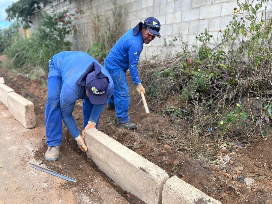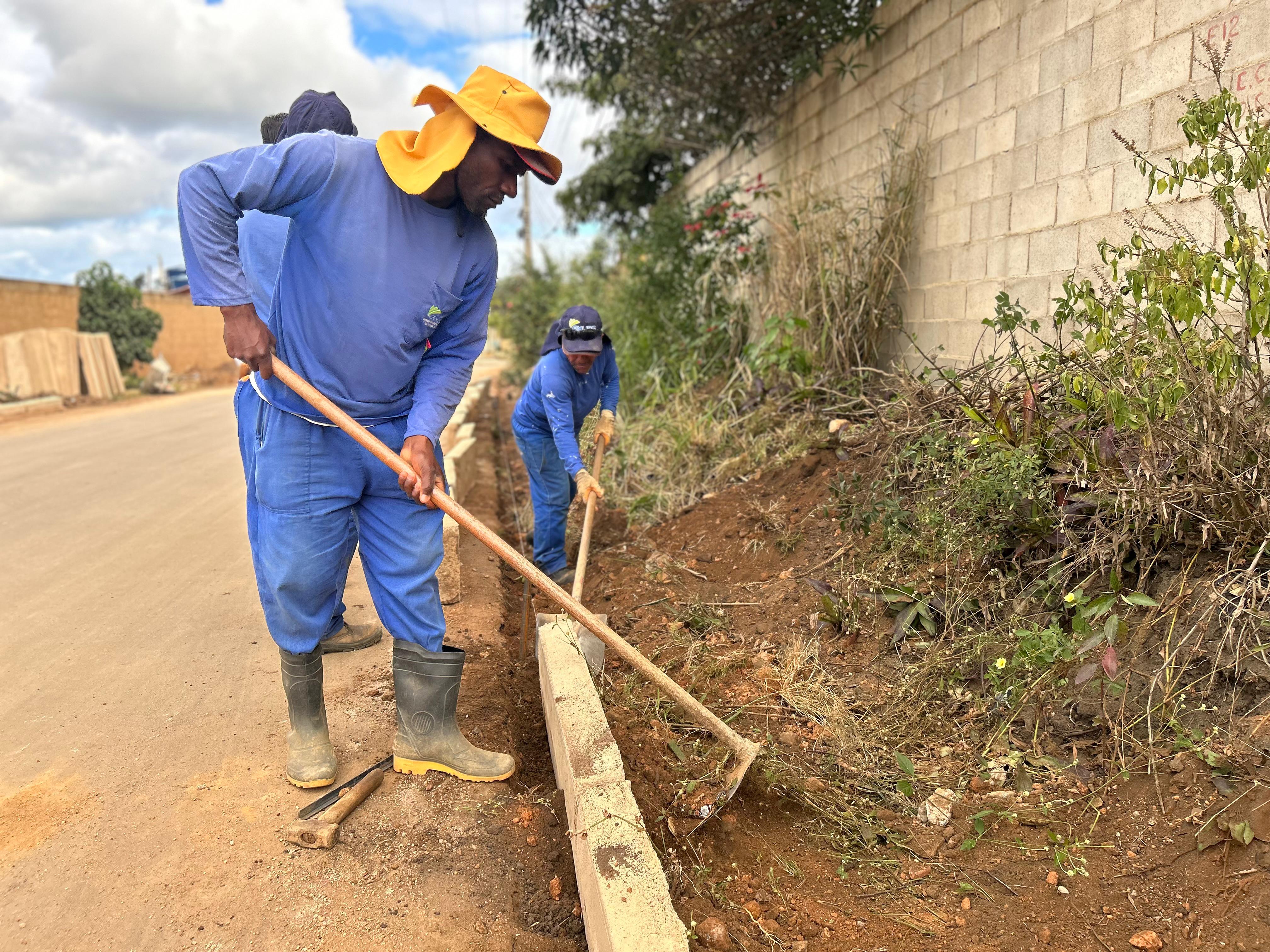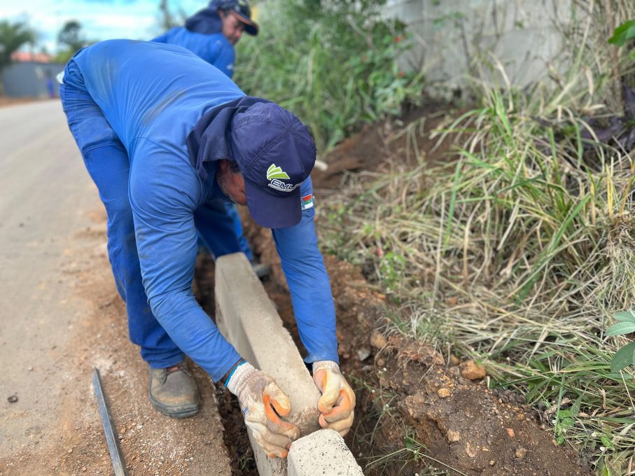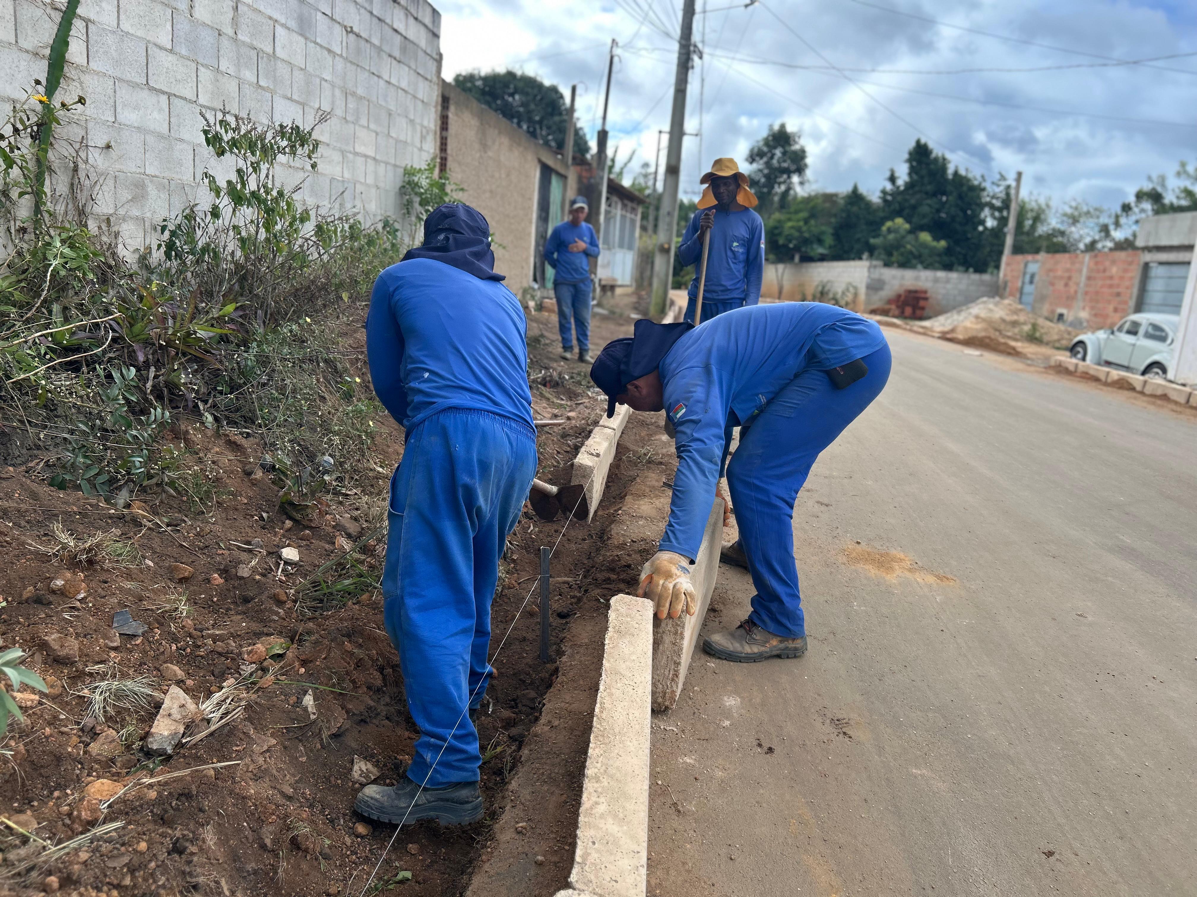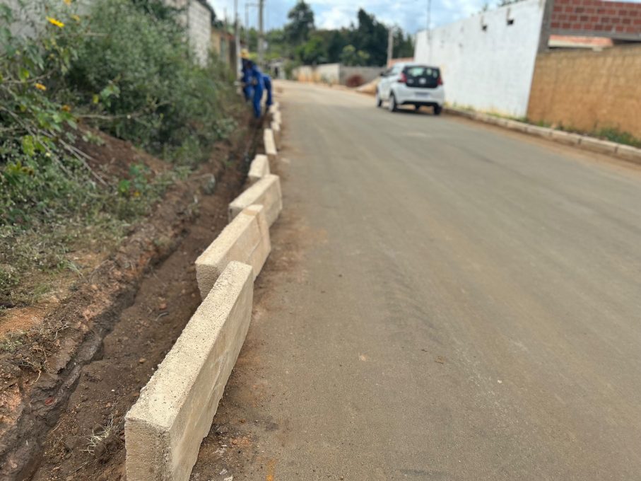Após realizar a terraplanagem e pavimentação asfáltica na rua, que possui 1.040 metros de extensão, a Emurc agora está executando o assentamento de meios-fios, que serão instalados ao longo de toda a via, nos dois lados.