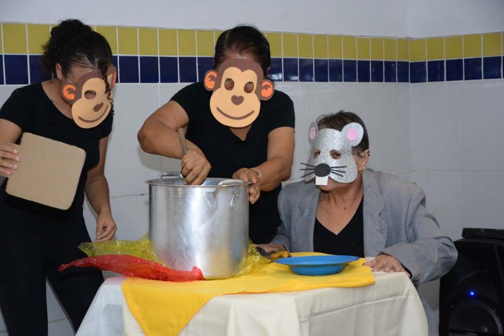 O Centro de Convivência do Idoso, mantido pela Secretaria Municipal de Desenvolvimento Social (Semdes) levou seu grupo teatral, as “Talentosas do CCI”, para encenar a clássica história infantil “O Casamento da Dona Baratinha” para alunos da Escola Cardoso e Albuquerque (Alto Maron), na tarde desta segunda-feira (10). Além da peça infantil, o grupo levou aos pequenos outros dois personagens: os palhaços Pirraça e Pirracita, que coordenaram um sorteio de brindes entre os alunos.