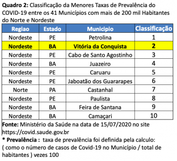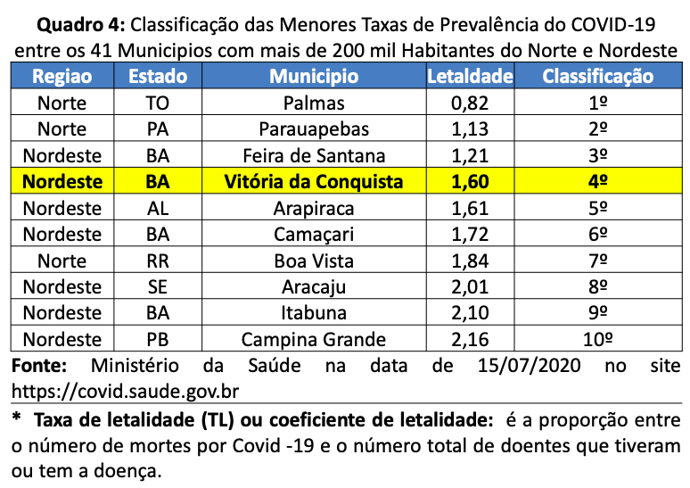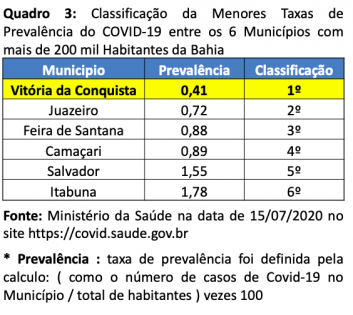 Após a análise dos dados estatísticos referentes às taxas de contaminação e de ocupação de leitos por munícipes de Vitória da Conquista, contatou-se que os números do município estão controlados e abaixo de outras cidades da Bahia de menor porte. Segundo o coordenador do Comitê de Crise, Kairan Rocha, apesar do aumento da pressão hospitalar, o município de Vitória da Conquista tem realizado todos os esforços para continuar mantendo as menores taxas entre as grandes cidades do Estado. “Estatisticamente, a cidade não apresenta avanço significativo nos índices de infecção, transmissão, prevalência e mortalidade da doença, considerando a reabertura de setores do comércio. A abertura gradual tem sido feita em ampla discussão com todas as entidades e embasada em estatística e estudos sérios”, relata.