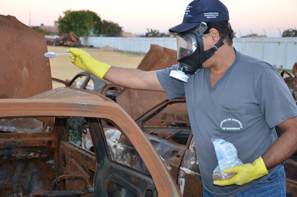 A equipe do Centro de Controle de Endemias, setor ligado à Secretaria Municipal de Saúde, passou o final da tarde desta sexta-feira, 2, no terreno localizado ao lado do Departamento de Polícia Técnica de Vitória da Conquista. Percorrendo o amontoado de automóveis inutilizados, recentemente transferidos para o local, os funcionários borrifaram produtos como o Malation e a Alfacipermetrina, inseticidas eficazes no combate a possíveis focos de larvas do Aedes Aegypti, o mosquito transmissor da dengue.