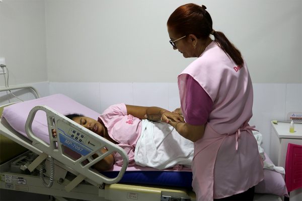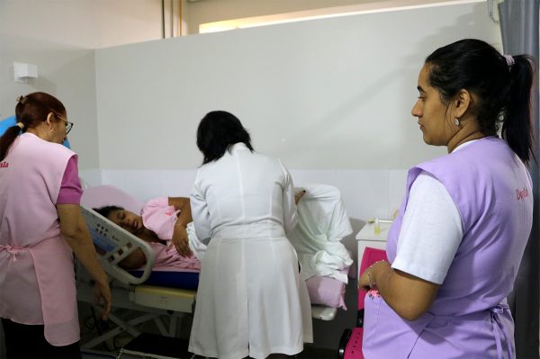 Doula em treinamento, Maria do Socorro, assiste gestante em trabalho de parto no Centro Obstétrico