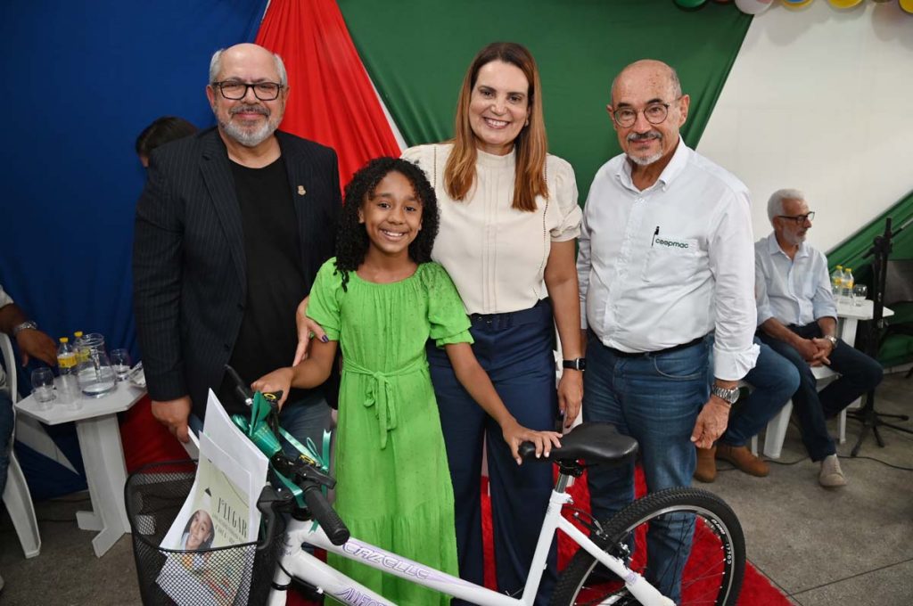 - A aluna vencedora, Lara Victória, com o secretário Edgard Larry, a prefeita Sheila Lemos e Cesar Nery, da Coopmac