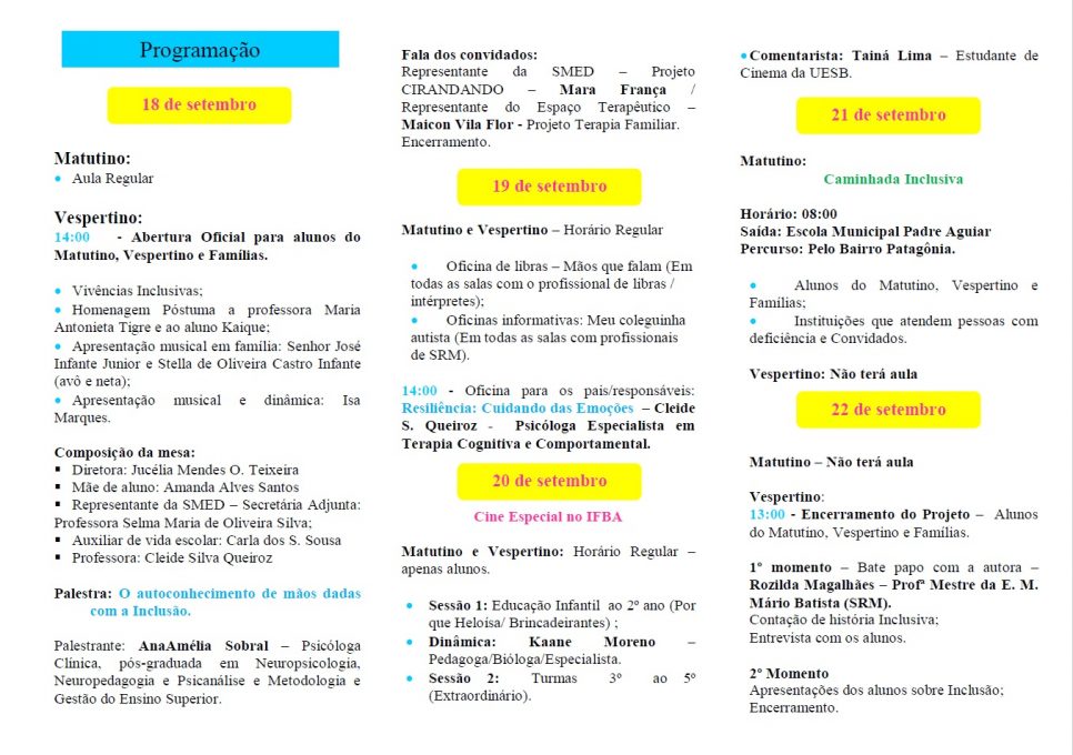 Na abertura do projeto, no dia 18, às 14h, será apresentada a palestra “O autoconhecimento de mãos dadas com a Inclusão”, com a psicóloga-clínica, Ana Amélia Sobral. Haverá também uma homenagem póstuma à professora Maria Antonieta Tigre e ao aluno Kaique, e apresentações musicais da aluna Stella de Oliveira Castro Infante com seu avô José Infante Júnior, e de Isa Marques, que também fará dinâmicas.