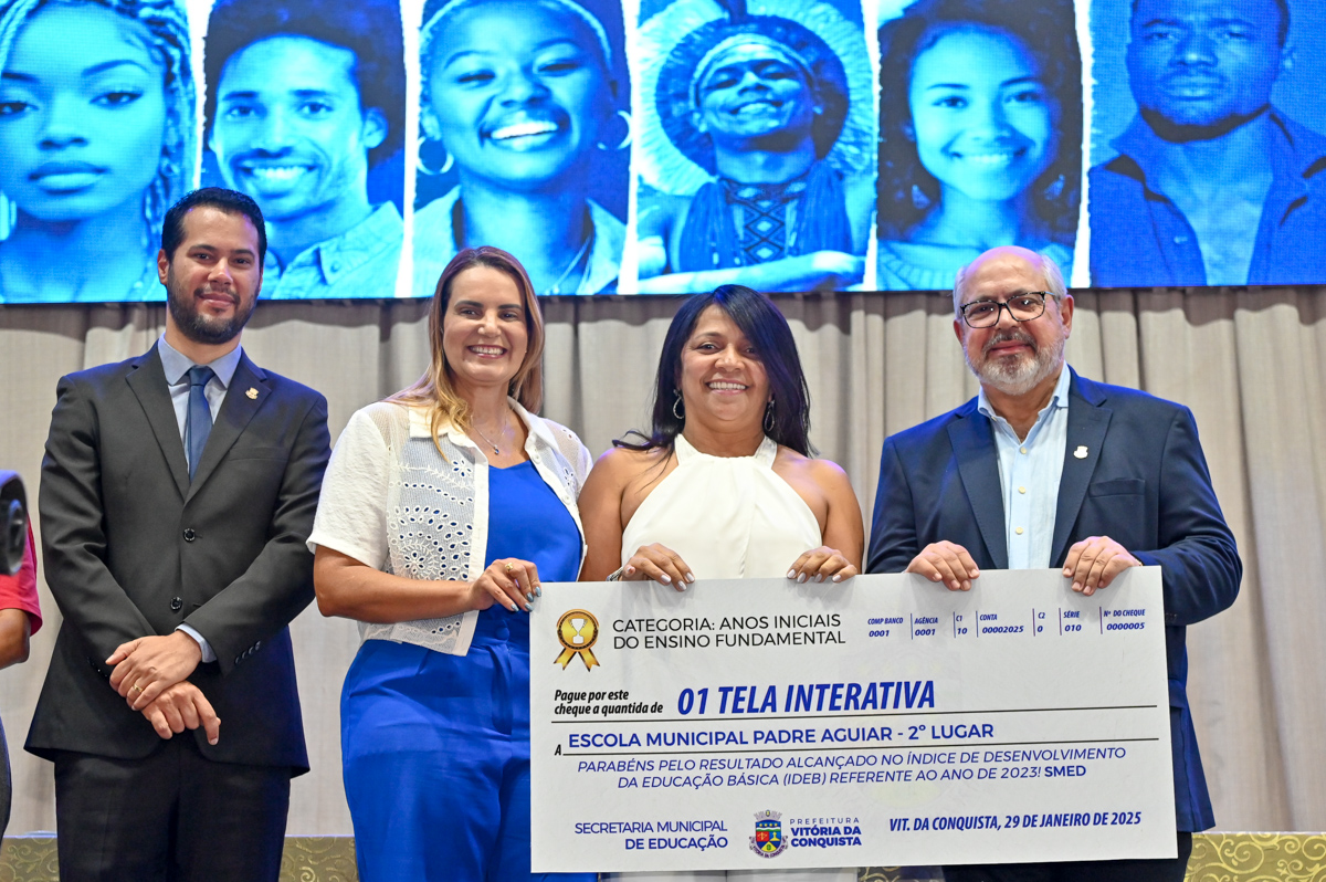 A Secretaria Municipal de Educação (Smed) e a Secretaria Municipal da Transparência, Controle e Prevenção à Corrupção (STPC) aproveitaram o encontro de todos os professores da Rede Municipal de Ensino, na abertura da Jornada Pedagógica, para realizar a premiação das escolas do Município que se destacaram no Índice de Desenvolvimento da Educação Básica (Ideb) 2023, e na boa gestão do Caixa Escolar, por meio do Selo Escola Transparente, criado pelo Governo Municipal em 2019. A prefeita Sheila Lemos, acompanhada dos secretários Edgard Larry e Mateus Novais, premiou as escolas vencedoras.