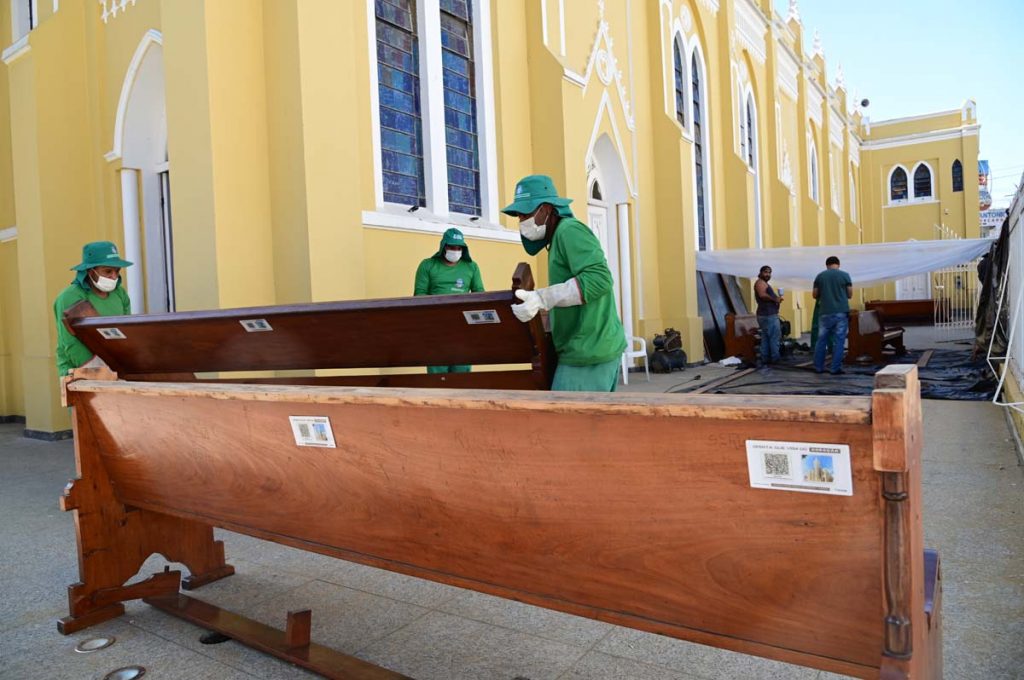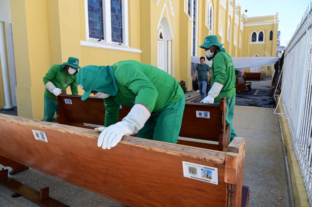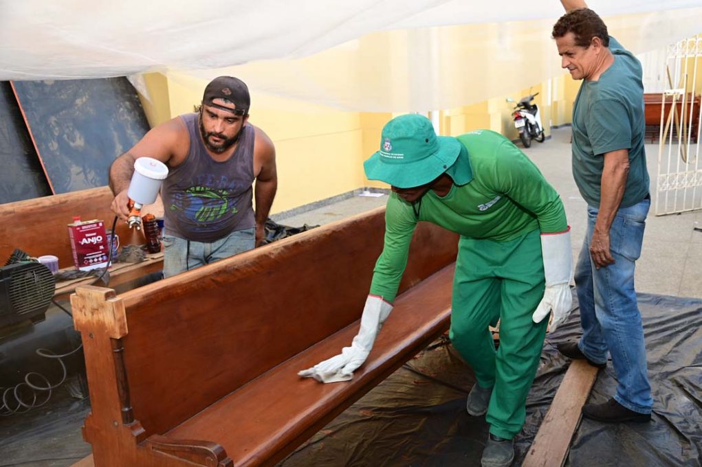Desde a última segunda-feira (28), apenados do programa vinculado à Secretaria Municipal de Governo lixam e envernizam os bancos para harmonizar com a Catedral que recentemente foi reformada. “Hoje, temos uma Catedral renovada. Observamos que os bancos estavam desgastados e sujos. A equipe agora está revitalizando a área dos bancos, onde as pessoas se sentam e buscam conforto durante a celebração”, comentou um dos presidentes da Comissão Organizadora, Célio Guimarães.