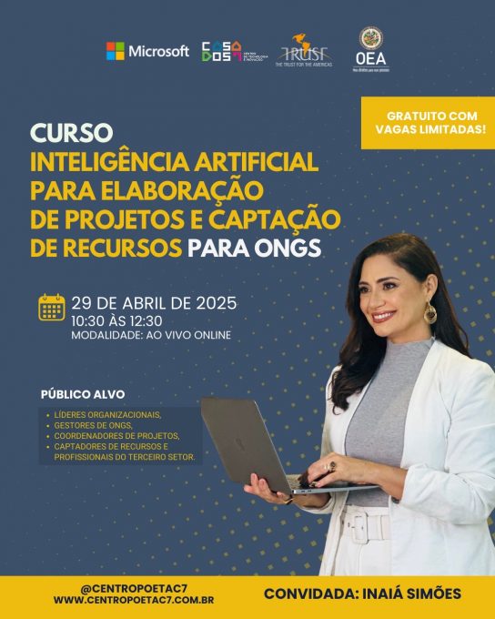 Estão abertas as inscrições do Curso com ferramentas de Inteligência Artificial (IA) para ONGs e projetos sociais. A iniciativa é organizada pelo Centro de Tecnologia e Inovação Casa dos Sete, parceiro da Prefeitura Municipal, em conjunto com The Trust for the Americas e Microsoft. O objetivo é potencializar líderes e coordenadores de organizações que atuam em causas sociais, sem fins lucrativos, por meio da inovação e tecnologia.