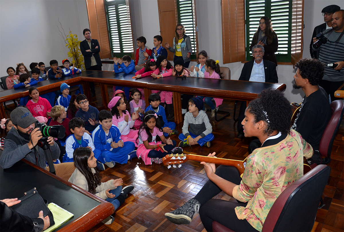 Finalizando a visita, os estudantes assistiram e participaram de uma apresentação musical. Os professores do Conservatório Municipal de Música, Daniel Nepomuceno e Bruno Barbosa, e a aluna Gleiciane Barbosa, cantaram e tocaram algumas canções para as crianças, que foram convidadas a se juntar ao coro.