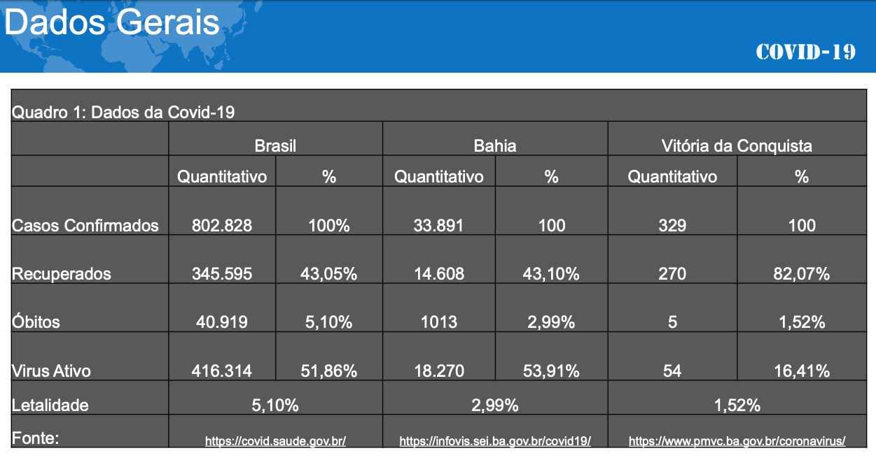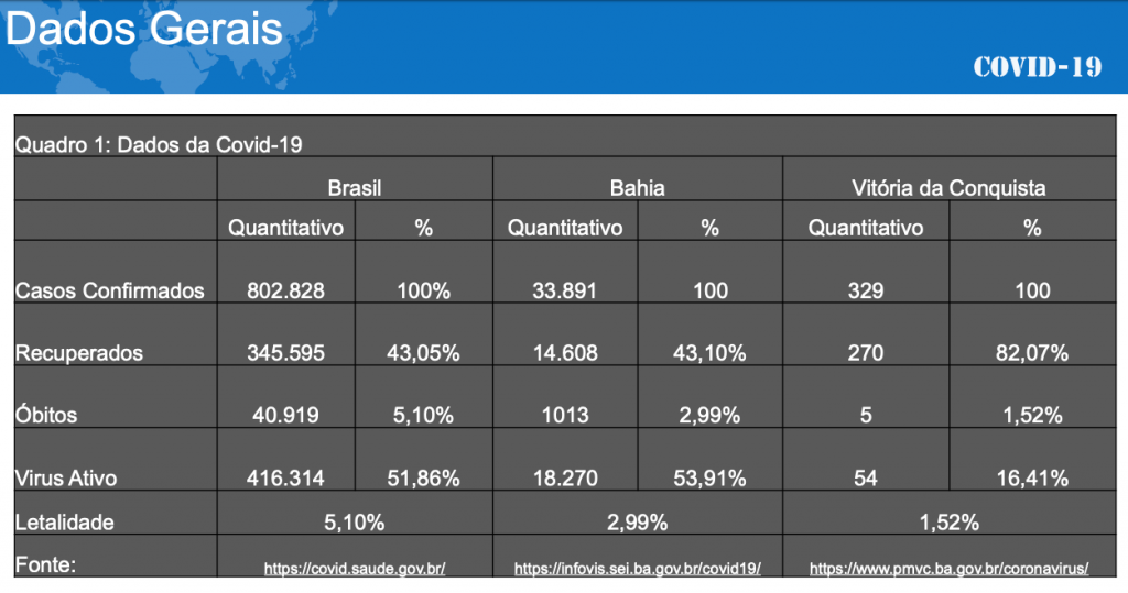 O objetivo da reunião de hoje foi apresentar os dados epidemiológicos da Covid-19 em Vitória da Conquista e as próximas medidas do Plano de Retomada das Atividades Comerciais. Segundo o monitoramento da Secretaria de Saúde, a taxa de cura de pacientes do município tem sido muito superior à média nacional e estadual. Já a taxa de mortalidade de pacientes contaminados é inferior tanto em comparação com a Bahia, quanto com o Brasil.