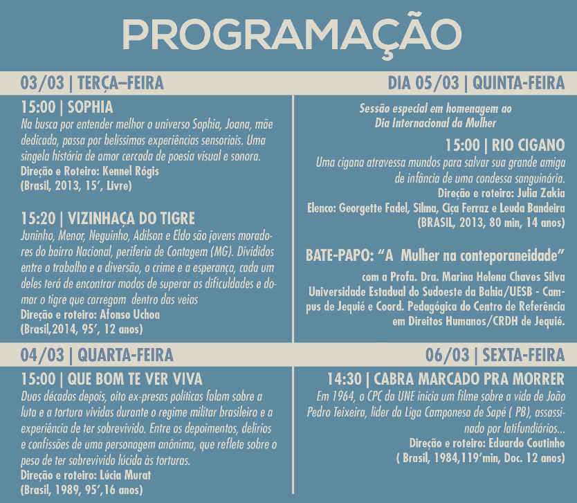 A 9ª Mostra de Cinema e Direitos Humanos no Hemisfério Sul segue movimentando Vitória da Conquista. Na próxima terça-feira, 3, a atividade, chega à Casa Memorial Régis Pacheco. A mostra é uma ação da Secretaria de Direitos Humanos da Presidência da República, em parceria com o Ministério da Cultura e a Universidade Federal Fluminense.