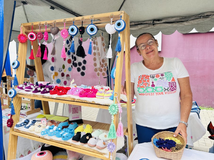 Uma das participantes da feira é a artesã Alice Maia, que compartilha sua experiência na Economia Solidária, na qual está envolvida há 4 anos. Para ela, o artesanato vai além de uma atividade que agrega renda extra ao orçamento, sendo também uma terapia para evitar problemas de depressão e ansiedade. “A Economia Solidária me proporcionou uma nova perspectiva de trabalho e de vida. Poder criar peças únicas e ver o reconhecimento das pessoas é gratificante. Além disso, o artesanato me ajuda a cuidar da minha saúde mental, proporcionando momentos de relaxamento e satisfação”, afirma Alice.
