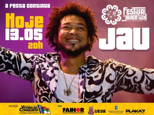 Nesta segunda-feira, 13, às 20h, o cantor baiano Jau se apresenta na Praça Barão do Rio Branco, centro de Vitória da Conquista, encerrando as atividades do Festival da Juventude – Ano II. O show que estava previsto para esse domingo, 12, não aconteceu devido às condições climáticas que impossibilitou o pouso do avião que o trouxe.