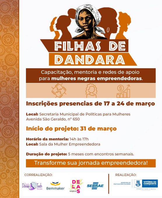 Para garantir o apoio e incentivo ao empreendedorismo de mulheres negras em Vitória da Conquista, a Secretaria Municipal de Políticas para Mulheres (SMPM), por meio da Sala da Mulher Empreendedora em parceria com o Sebrae e o Instituto Bemmaker, está com inscrições abertas para o projeto “Filhas de Dandara”, que ocorrem até a próxima segunda-feira (24), presencialmente na sede da SMPM, na Avenida São Geraldo, nº 650.