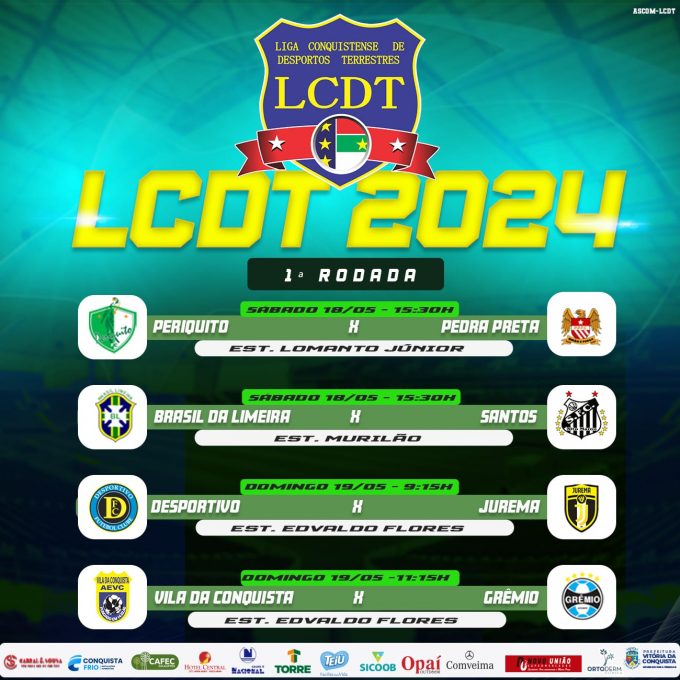O fim da primeira rodada do Campeonato Municipal de Futebol da Série A acontece neste final de semana. Os dois jogos do sábado (18) ocorrem de forma simultânea, às 15h30. O Periquito enfrenta Pedra Preta no Estádio Lomanto Júnior, e Brasil de Limeira recebe o Santos no Estádio Municipal da Zona Oeste, o Murilão. Os jogos no domingo (19) serão, em sequência, no Estádio Edvaldo Flores: Desportivo e Jurema se enfrentam, às 9h15, e Vila da Conquista joga contra o Grêmio às 11h15. O evento é promovido pela Liga Conquistense de Desportos Terrestres (LCDT) e conta com o apoio da Prefeitura de Vitória da Conquista