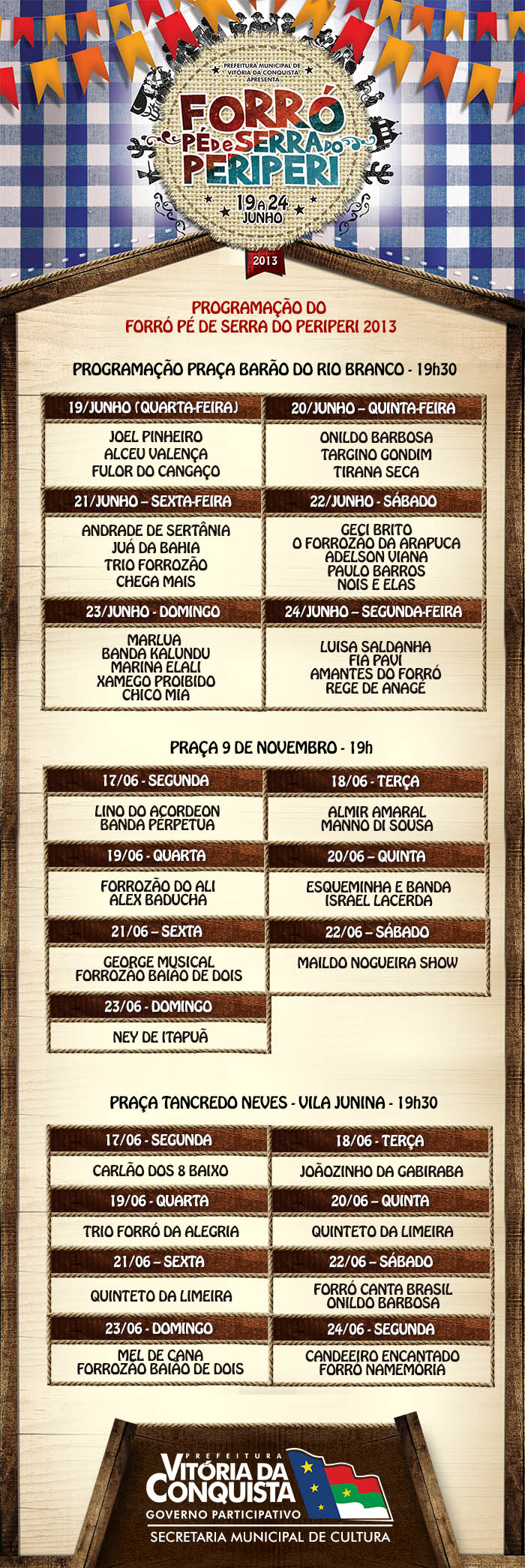 O Forró Pé de Serra do Periperi 2013, realizado pela Prefeitura de Vitória da Conquista, começa oficialmente nesta quarta-feira, 19, a partir das 19h30, na Praça Barão do Rio Branco. A primeira noite dos festejos juninos contará com os shows do cantor e compositor Alceu Valença e do forrozeiro local Joel Pinheiro.