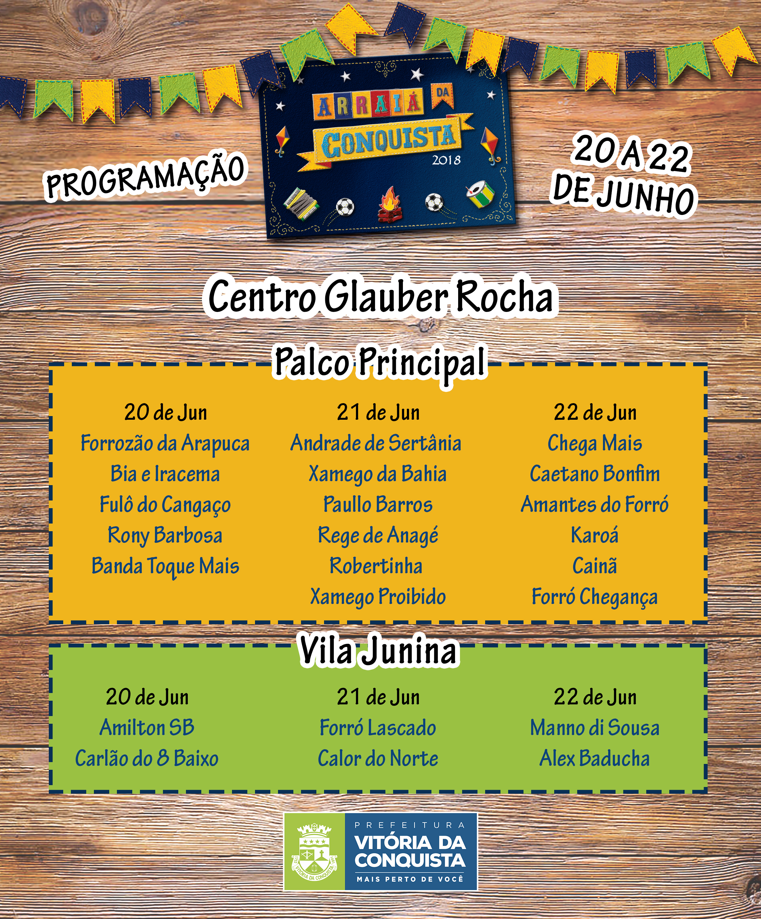 Na próxima semana, o Centro Glauber Rocha vai se transformar num verdadeiro salão de dança para quem gosta de arrastar a chinela e se balançar ao som do chiado da sanfona. A Prefeitura de Vitória da Conquista já está preparando o espaço para receber, nos dias 20, 21 e 22 de junho, o Arraiá da Conquista e suas atrações.