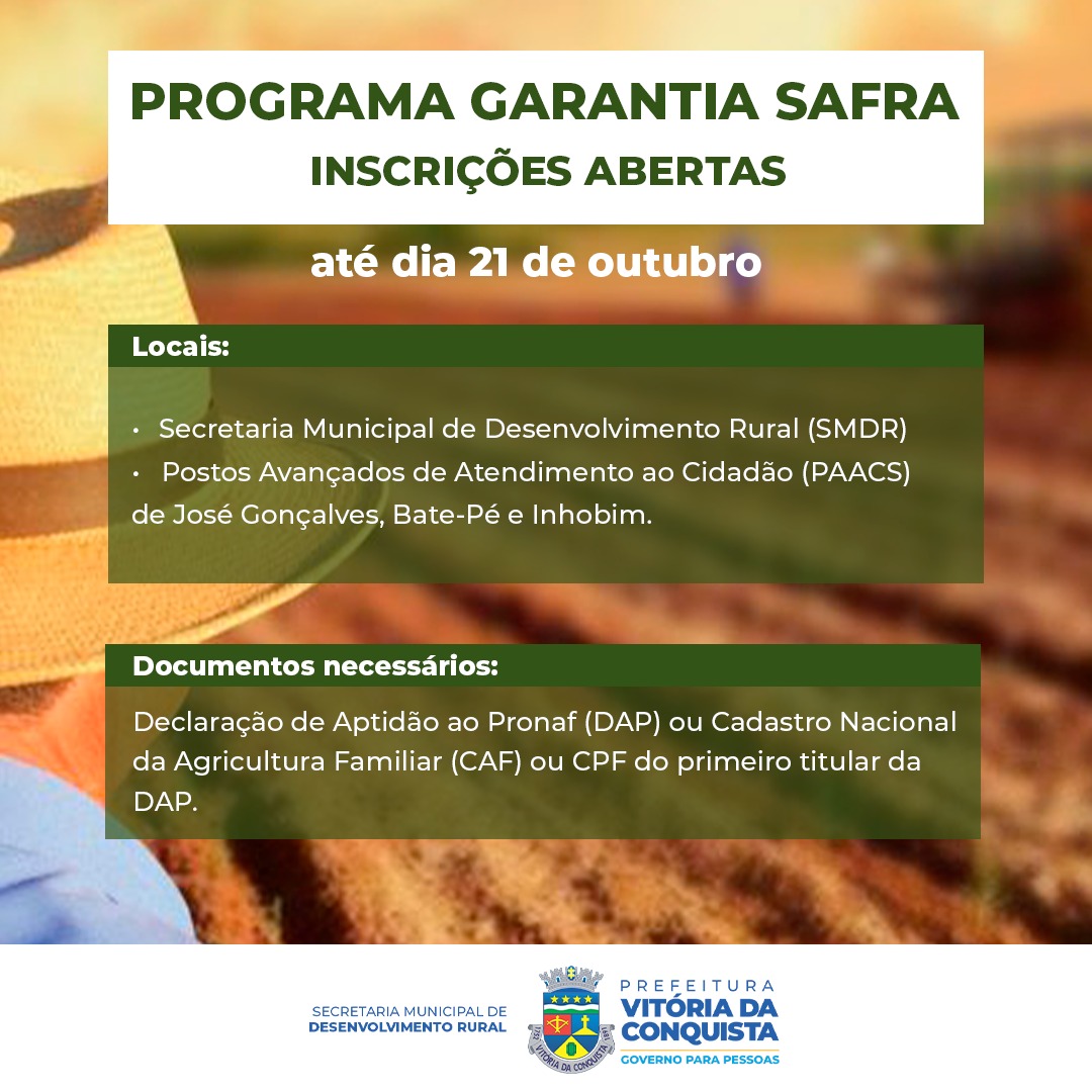 Agricultores familiares que ainda não estão inscritos no Garantia Safra e têm interesse de participar devem se dirigir à Secretaria Municipal de Agricultura e Desenvolvimento Rural (SMDR) até a próxima segunda-feira (21), para fazer o cadastro.