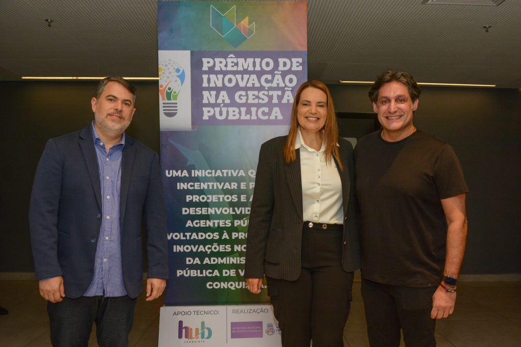 Prefeita, com Edivaldo Ferreira Jr e o palestrante Luís Gaban no lançamento do Prêmio de Inovação
