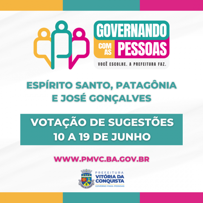 Quem mora ou trabalha nos bairros Espírito Santo e Patagônia e no distrito de José Gonçalves tem até esta quarta-feira (19) para votar em cinco sugestões de melhorias para estas localidades. É o programa Governando com as Pessoas, da Prefeitura de Vitória da Conquista, que dá vez e voz às demandas da população.