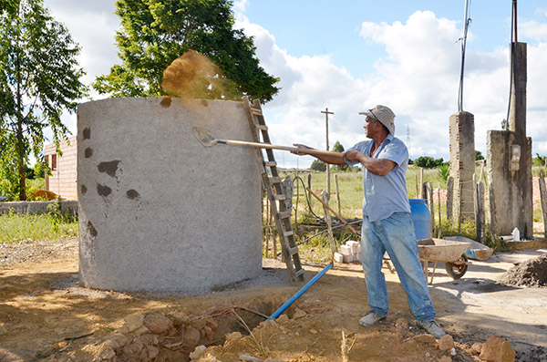 Ao poço, foi acrescentada uma tubulação de 700 metros de extensão, que avança pela ladeira e termina numa caixa d’água com capacidade para armazenar 10 mil litros – cuja base elevada está sendo construída defronte da casa de Manoel. É dali que os moradores irão retirar a água e levá-la até suas casas, assim que o sistema simplificado estiver plenamente concluído. “Vai mudar muito, porque eles vão contar com essa água para tudo”, prevê a agente comunitária de saúde Marileide Brito, que lida diariamente com as quase sessenta famílias que compõem a população de Caldeirão. “Eles vão ter um benefício muito grande”, conclui Marileide.