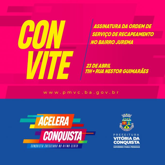 A Prefeitura segue realizando obras nos quatro cantos de Vitória da Conquista. Dessa vez, o contemplado será o Jurema. Hoje, às 11h, na Rua Nestor Guimarães, será realizado o ato de assinatura da Ordem de Serviço para recapeamento de quatro ruas do bairro.