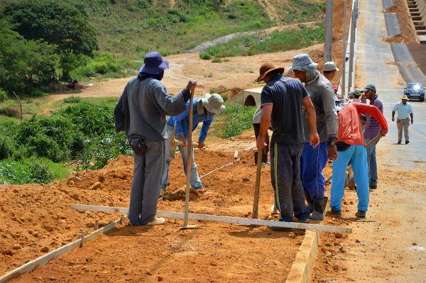 Operários trabalham na construção de passeios e na execução de dispositivos de drenagem