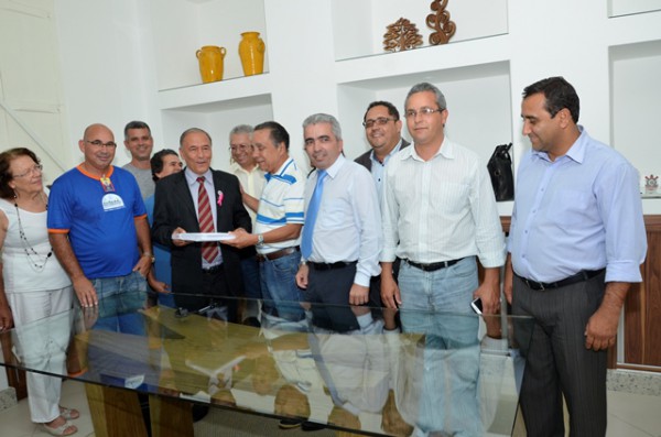 Representantes do Governo Municipal e membros da Executiva do Orçamento Participativo entregaram, na tarde dessa quarta-feira, 15, à Câmara Municipal a Lei Orçamentária Anual (LOA), referente ao ano de 2015. O documento foi recebido pelo presidente em exercício do Legislativo Municipal, o vereador Hermínio Oliveira, acompanhado por outros vereadores.